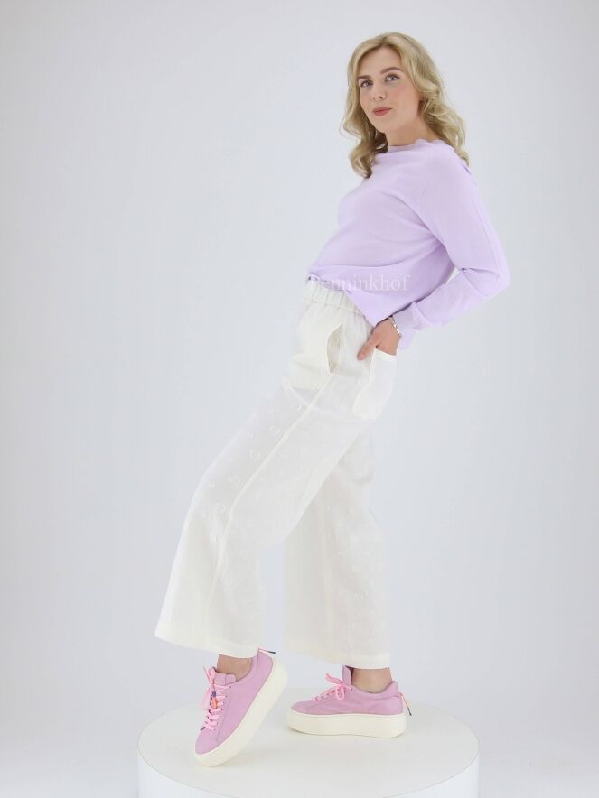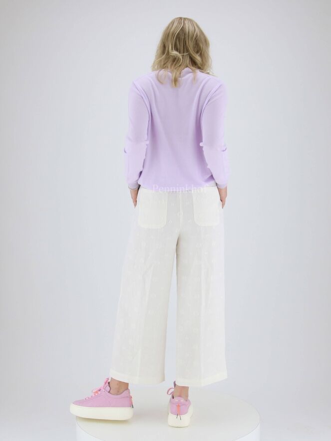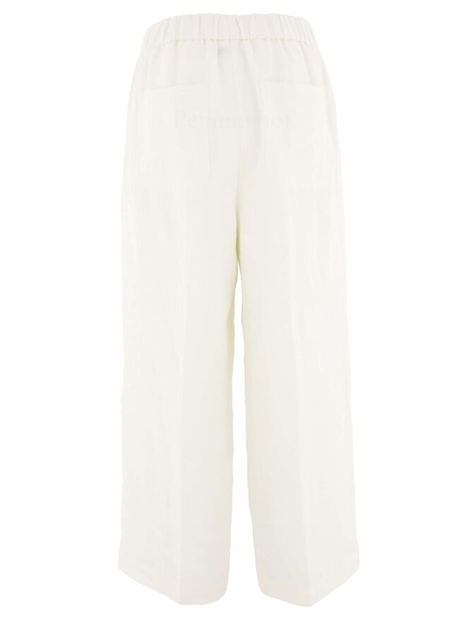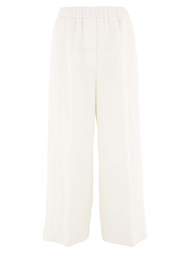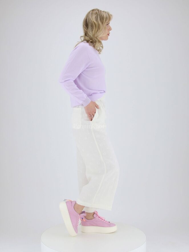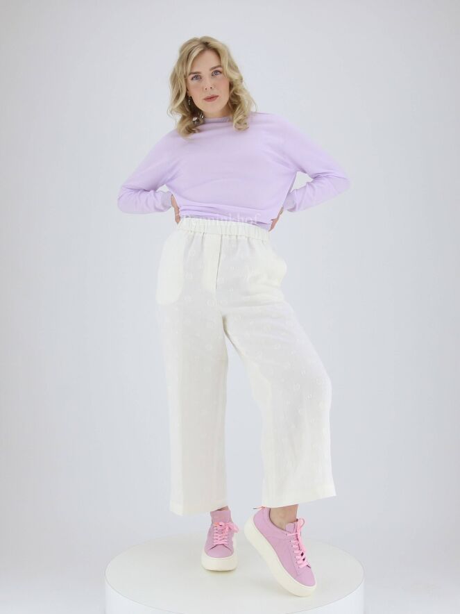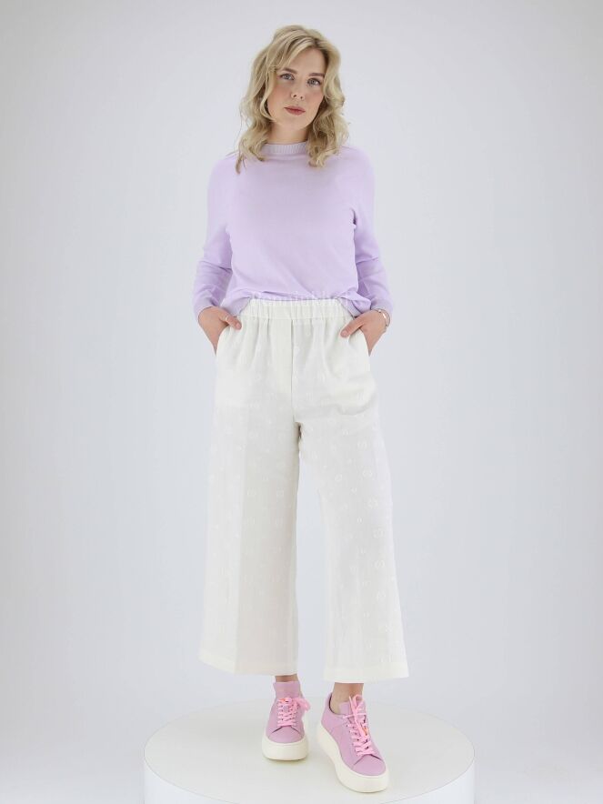Pants from Peserico in the color creamy white. Small and larger circles are embossed in the fabric. At the waist is a finely pleated elastic band. These pants can be washed by hand.