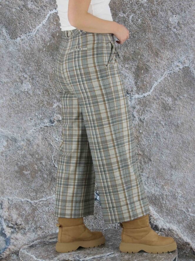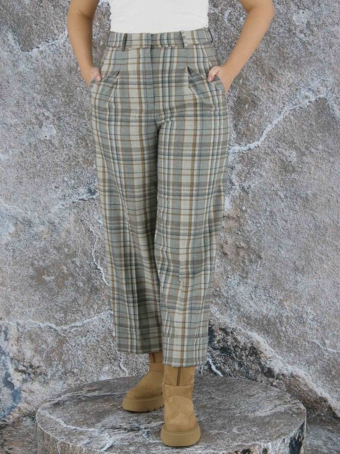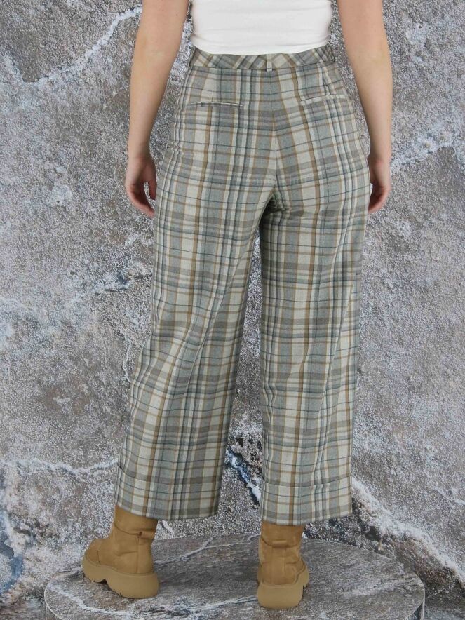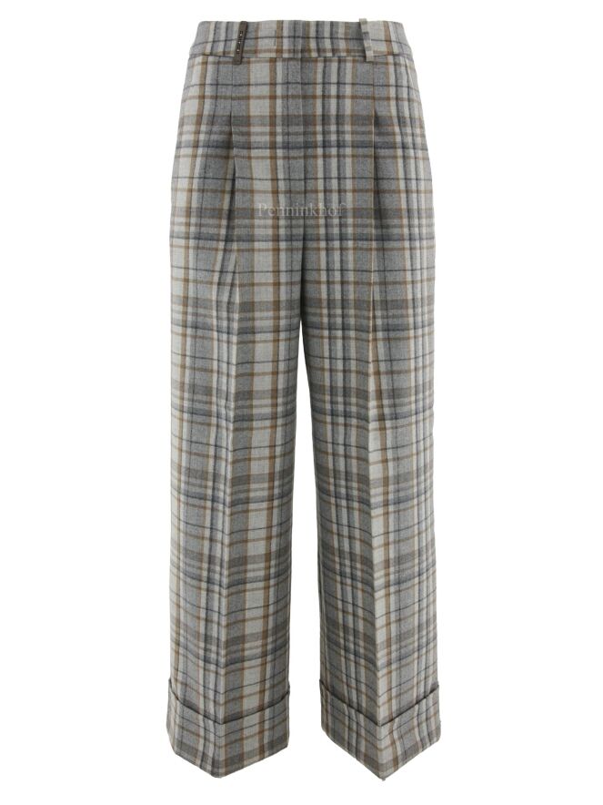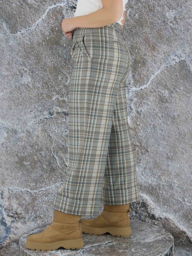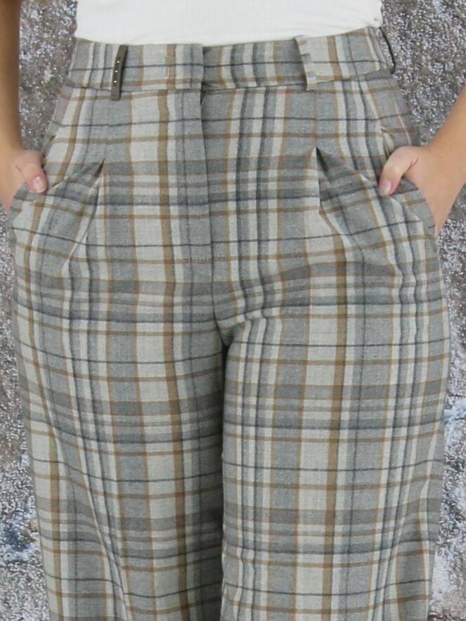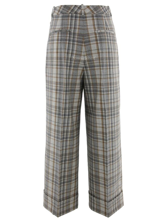 Wide trousers from Peserico in a checkered pattern with multiple shades of gray and camel. From the waist there are some pleats. The pants have side pockets and a wide turn-up at the bottom of the legs. These pants can be washed by hand.