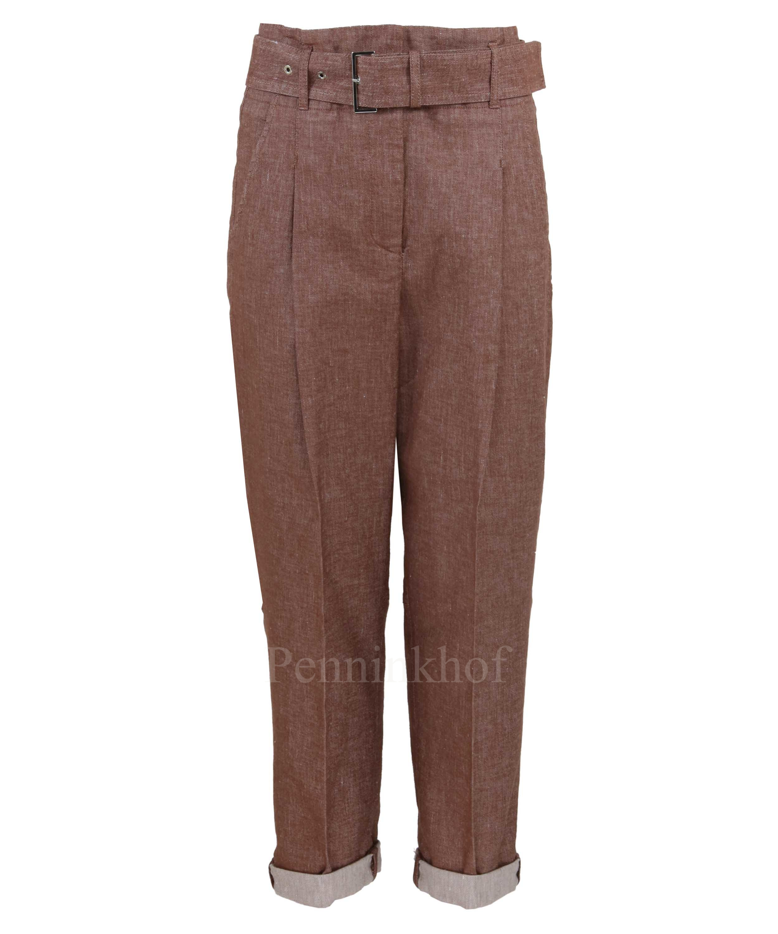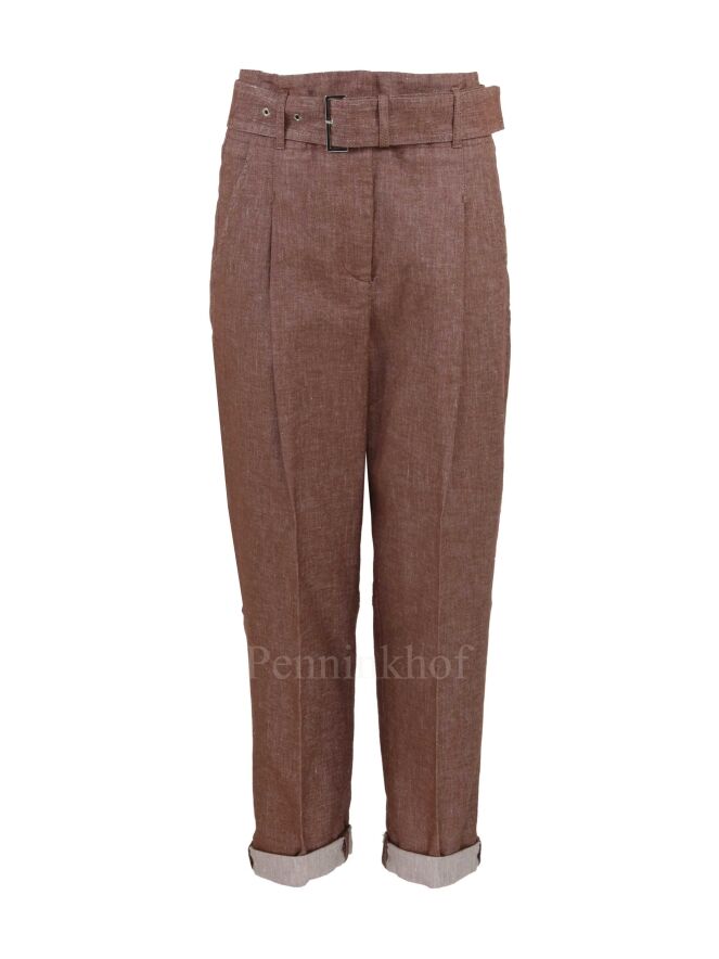Peserico pants in a mixed brown color. At the waist is a belt in the same fabric as the pants. the pants have pleats and side pockets. There is a short turn-up at the bottom of the legs. these pants can be washed at 40 degrees.
