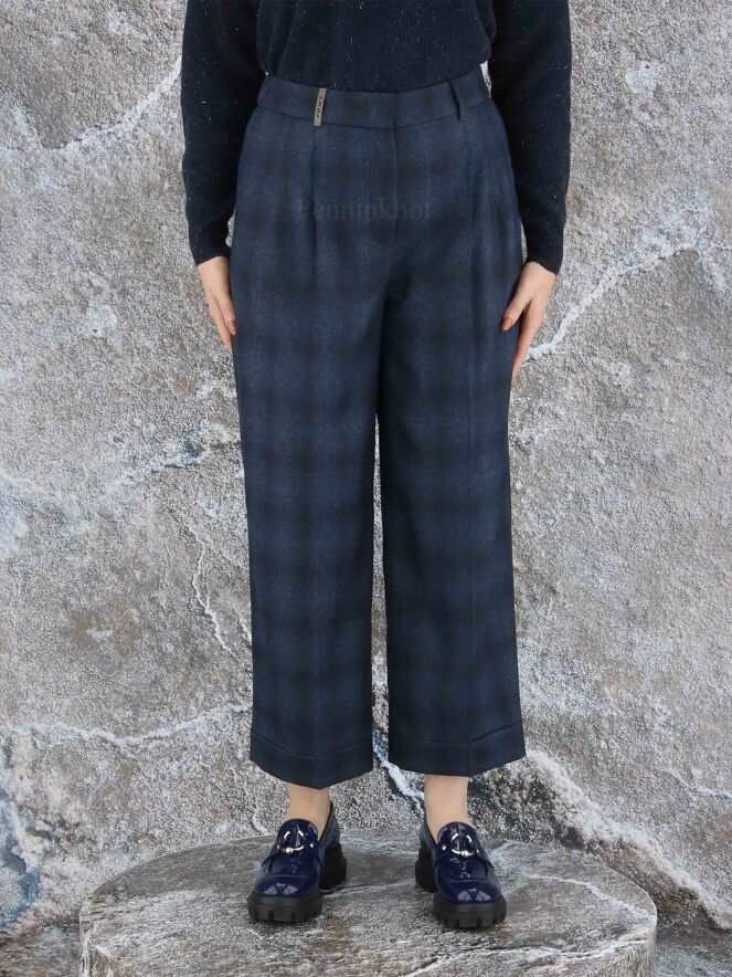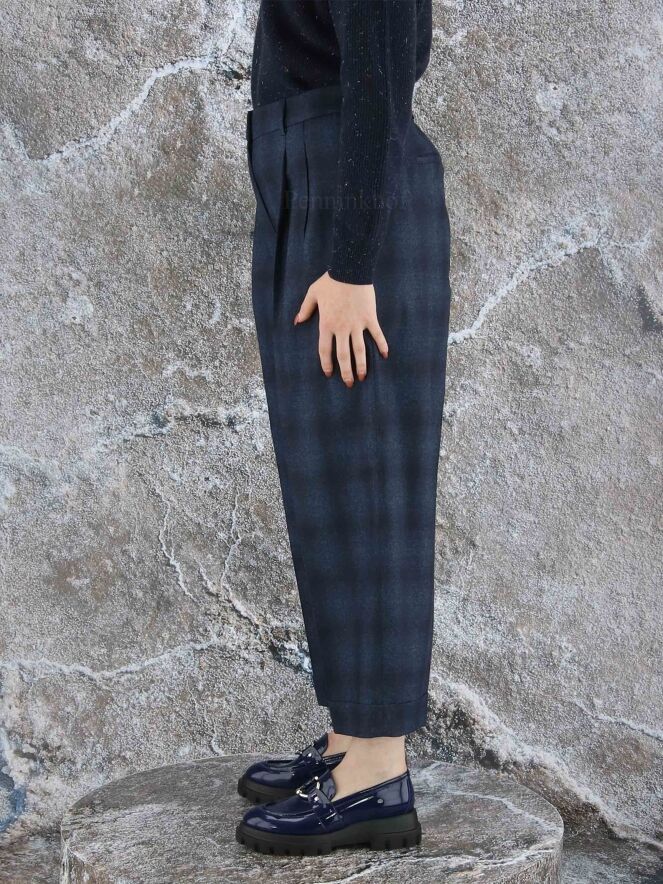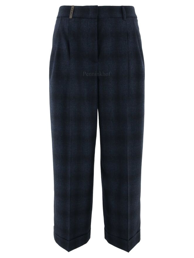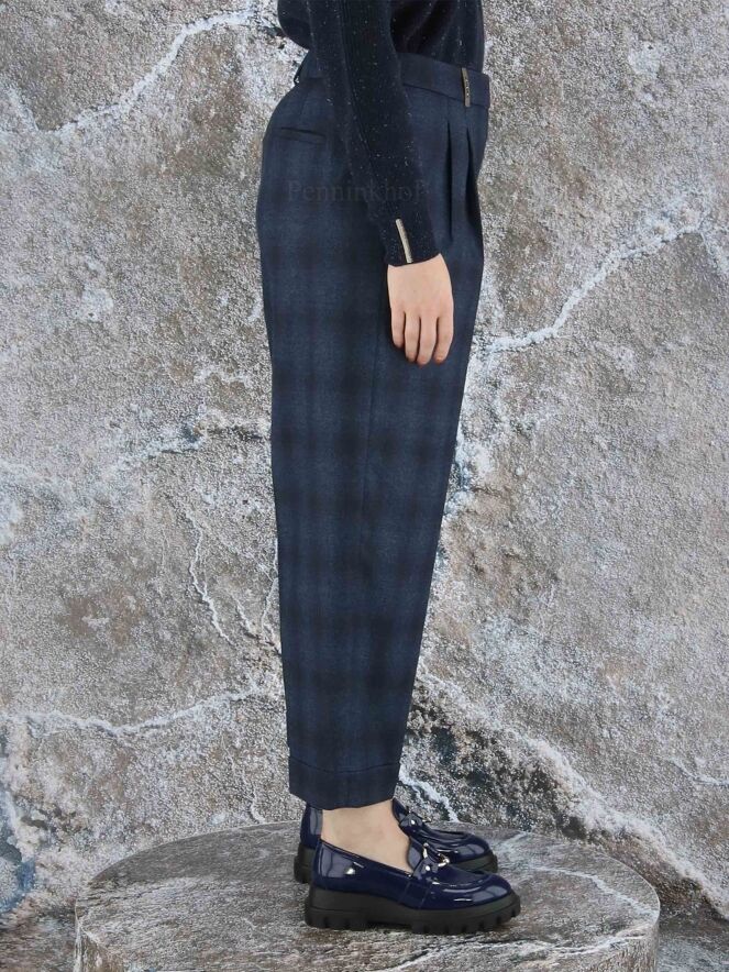 Luxurious trousers from Peserico in a degradé checkered pattern with the colors indigo blue and black. At the waist is a finely pleated elastic band. from the waist are some pleats. The pants have side pockets and a short turn-up at the bottom of the legs. These pants must not be washed.