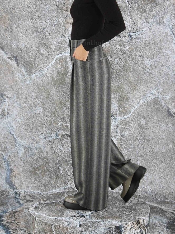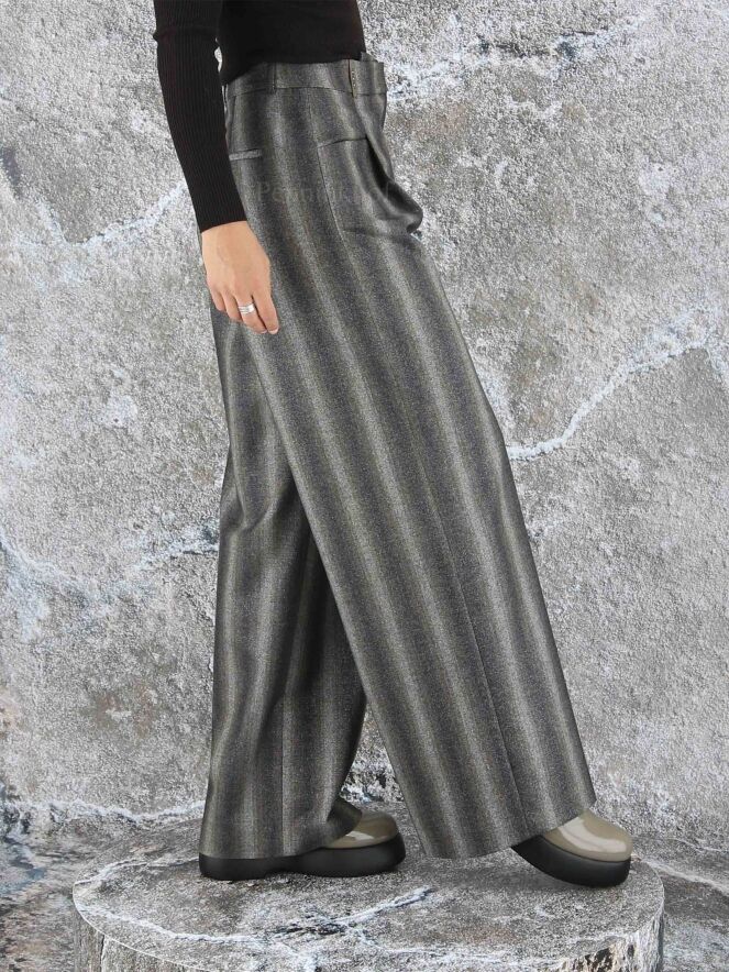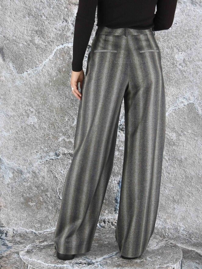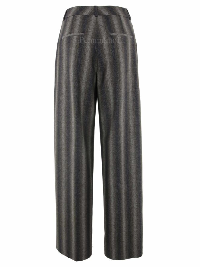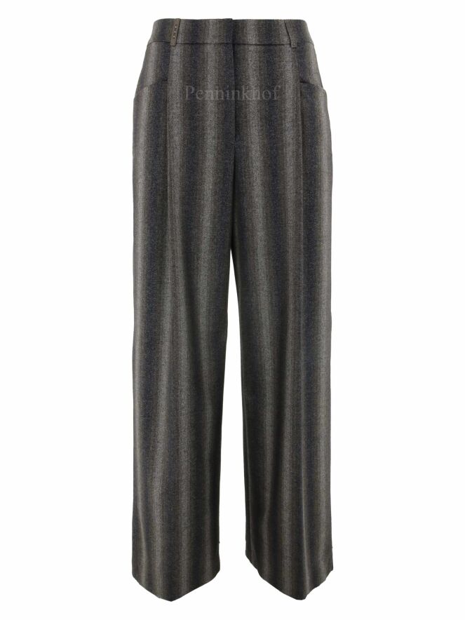 Wide-fitting pants from Peserico in a mixed stripes structure with the colors dark grey, beige, taupe and dark brown. A fine silver thread is woven through the fabric. The pants have 2 pleats that give the fabric of the legs a wavy "look". These pants must not be washed.