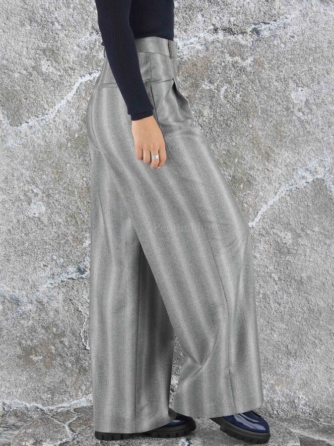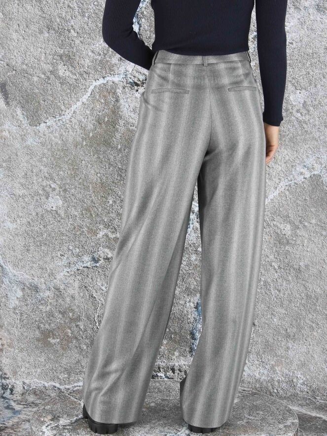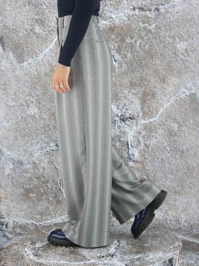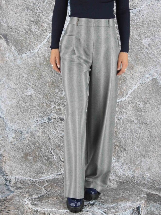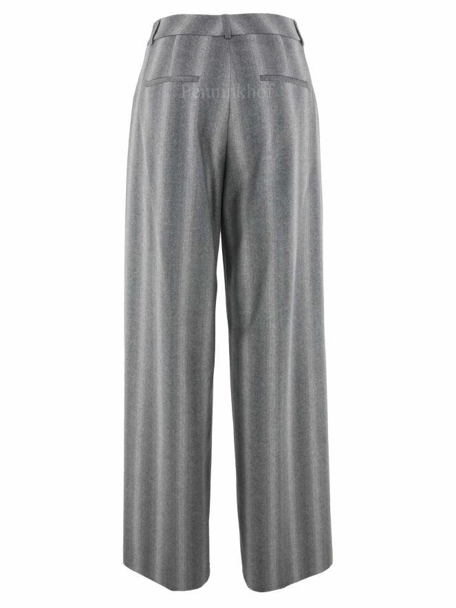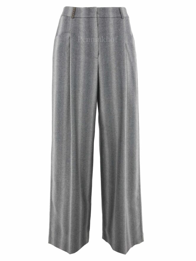 Wide-fitting trousers from Peserico in a mixed stripe structure with multiple shades of light grey. A fine silver thread is woven through the fabric. The pants have 2 pleats that give the fabric of the legs a wavy "look". These pants must not be washed.