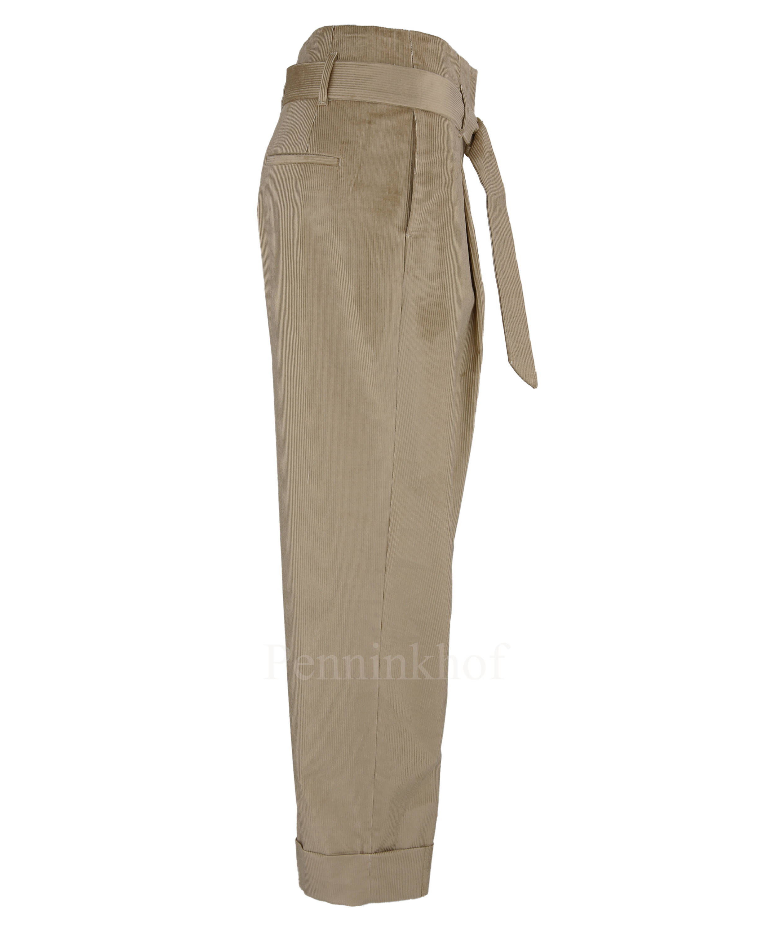 Rib cord pants from Peserico in a slightly shiny camel color. At the waist is a belt in the same fabric as the pants. The pants have side pockets and pleats. At the bottom of the pipes is a cover. These pants must not be washed.