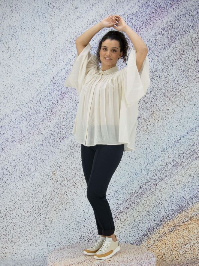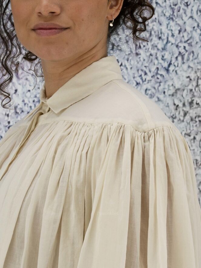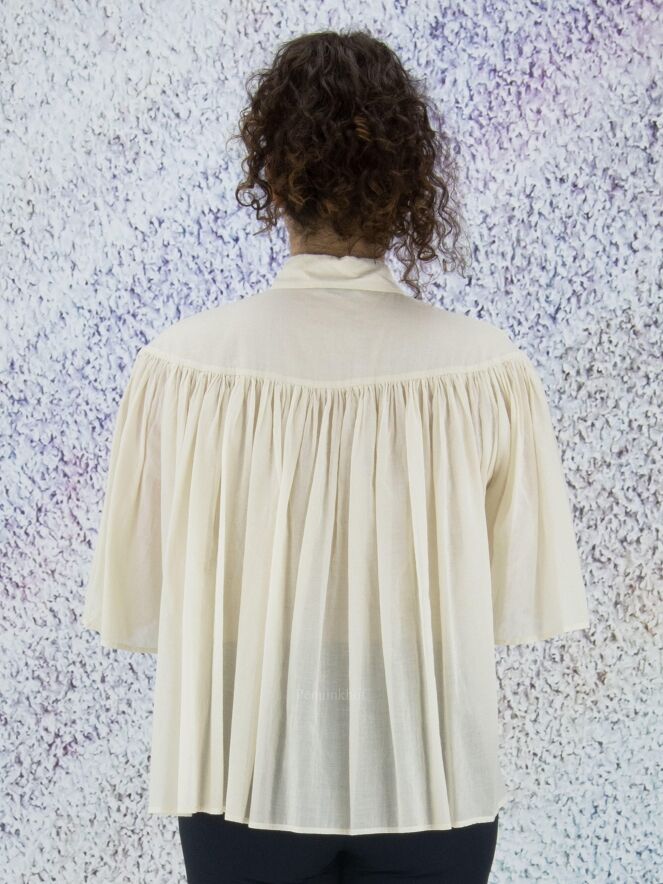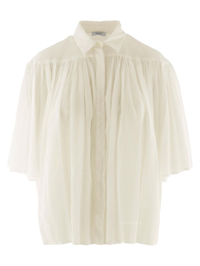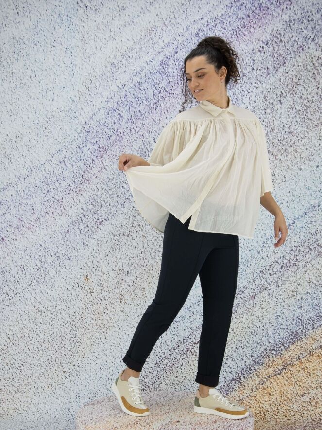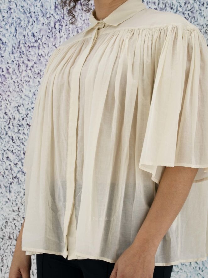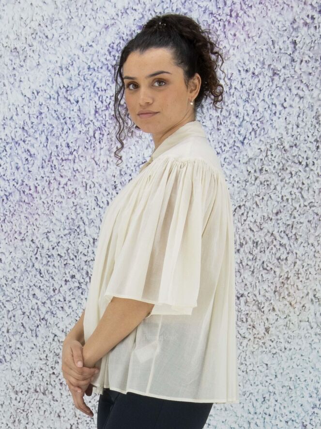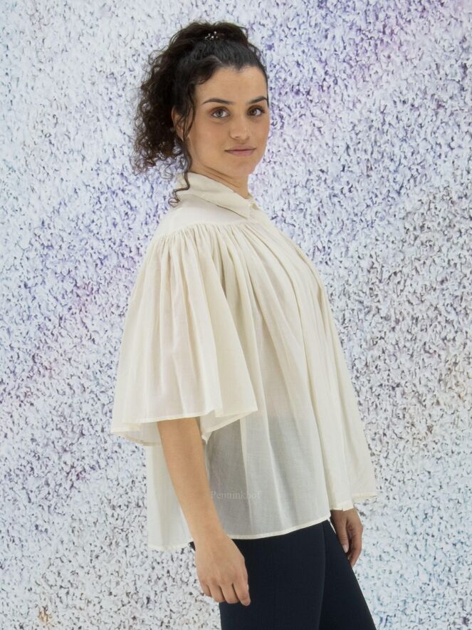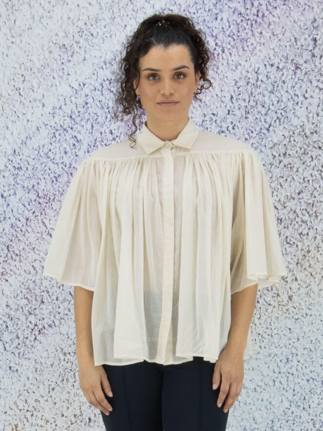 A slightly transparent blouse from Peserico in the color cream white. Below the neckline is a seam from which the fabric is finely pleated. The blouse has a hidden button closure and can be washed at 30 degrees.