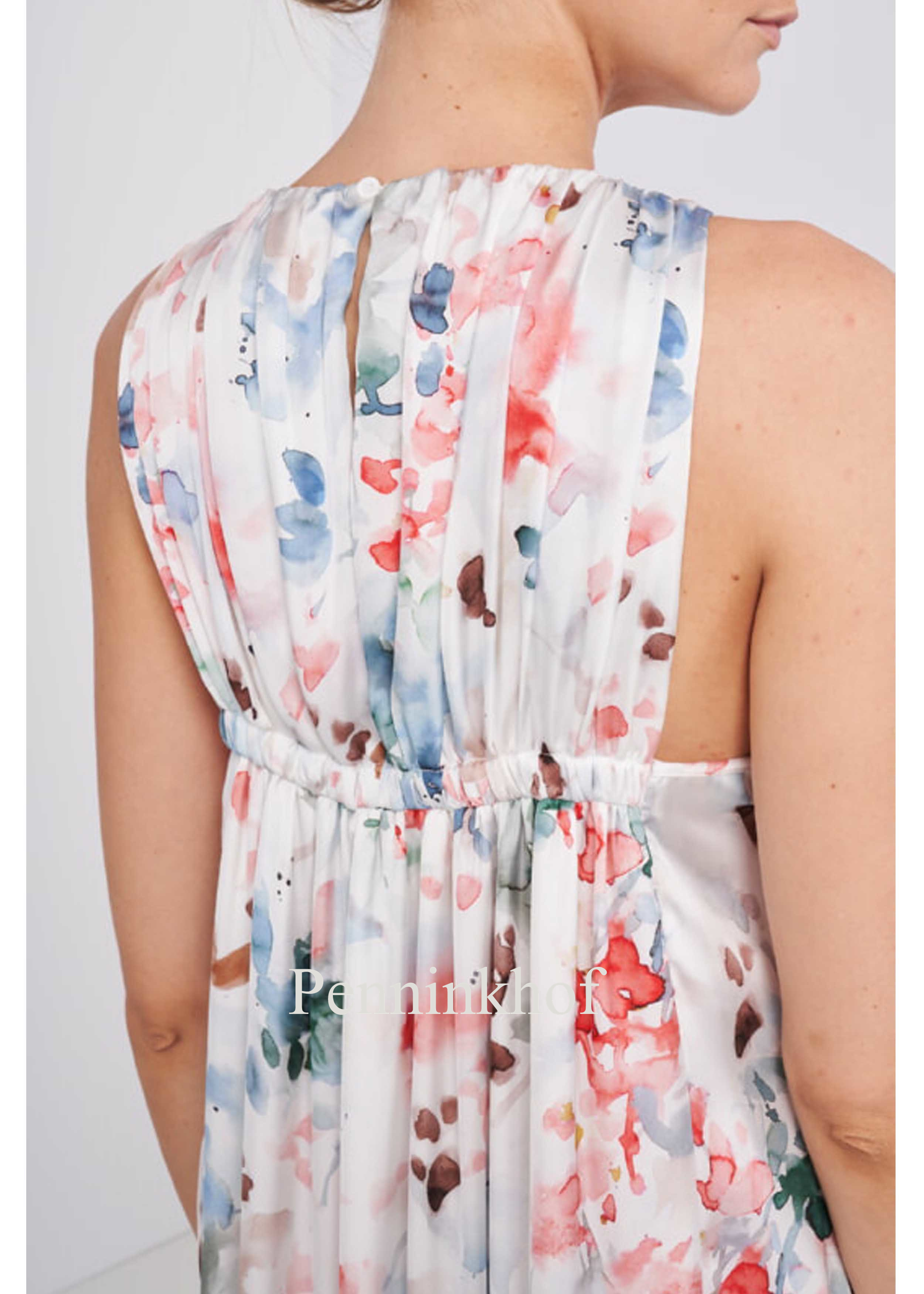 A matte satin dress from Peserico in a graphic print with the colors blue, red, green and brown on a white background. The dress has a round neck and is lined. From the waist down, the dress is in an A - Line. At the back there is a narrow, finely pleated elastic band at the waist and a stitching seam at the hip. This dress cannot be washed.
