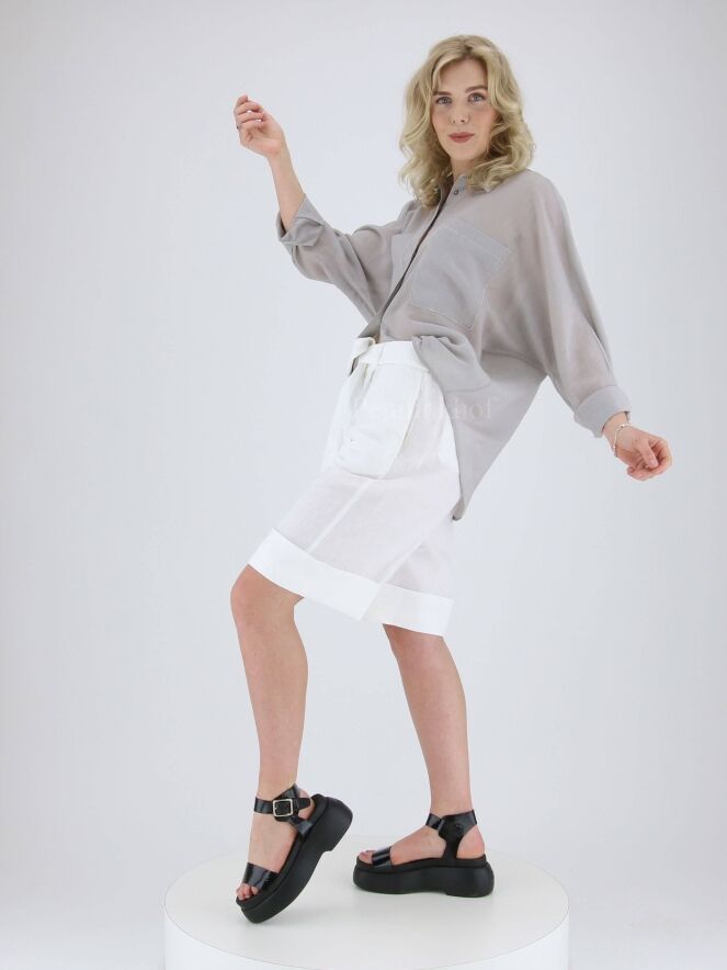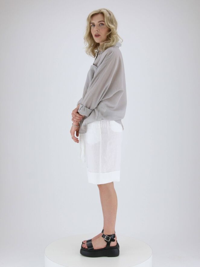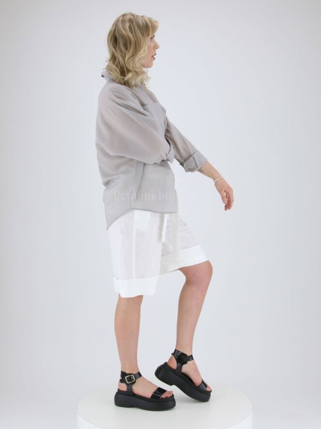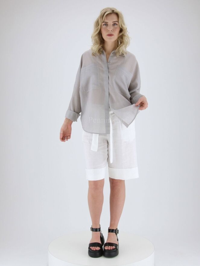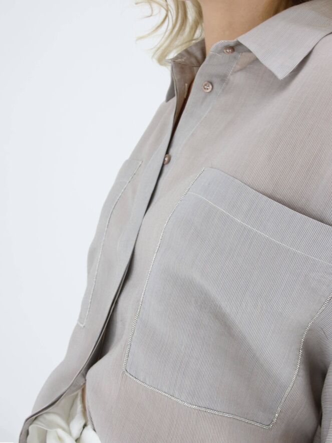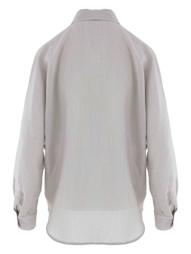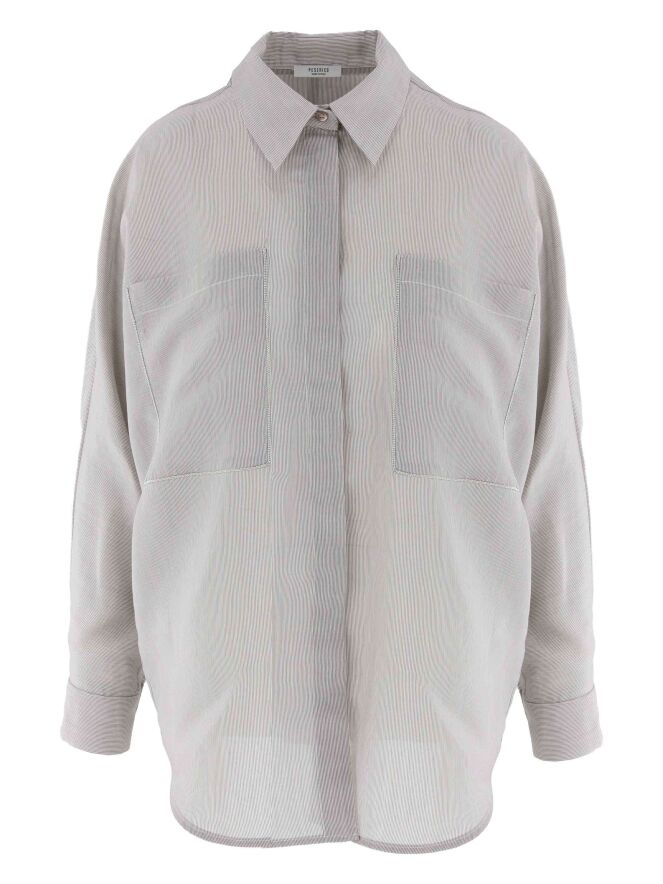 A blouse from Peserico in a fine vertical stripe structure with the colors gray and white. The blouse has bat sleeves. Along the edge of the breast pockets is a silver colored stitching. This blouse can be washed by hand.