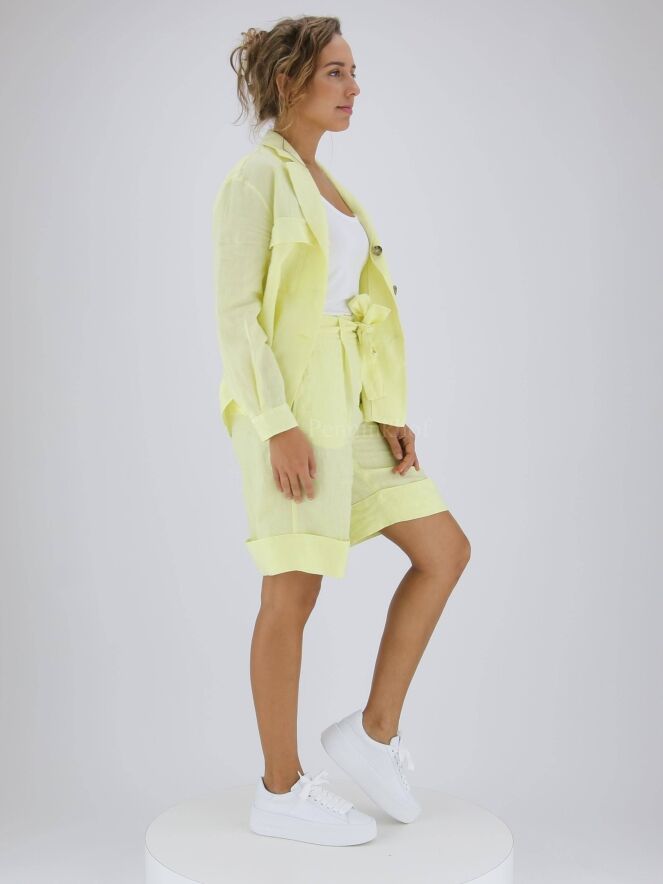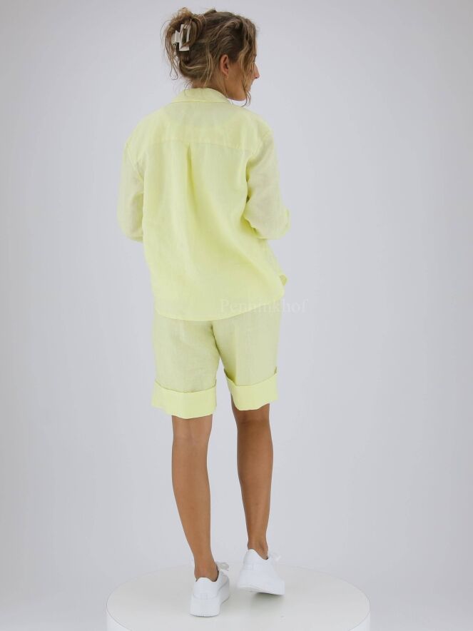 A blouse from Peserico in a pastel yellow color. The blouse has a 3-button closure and at the back there is a stitching at the height of the shoulder blades with a pleat in the middle. This blouse can be washed at 30 degrees.
