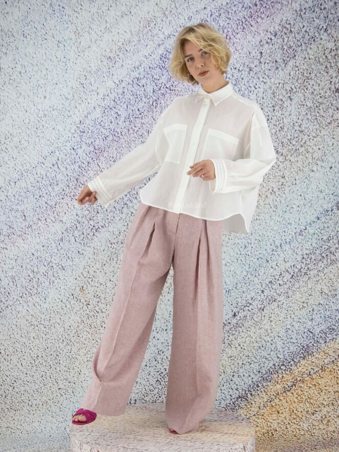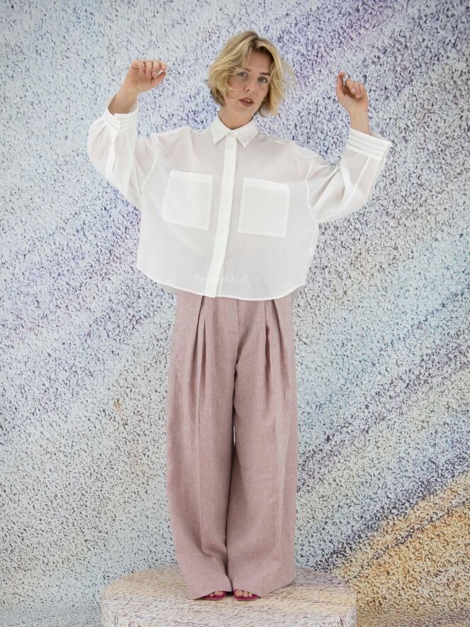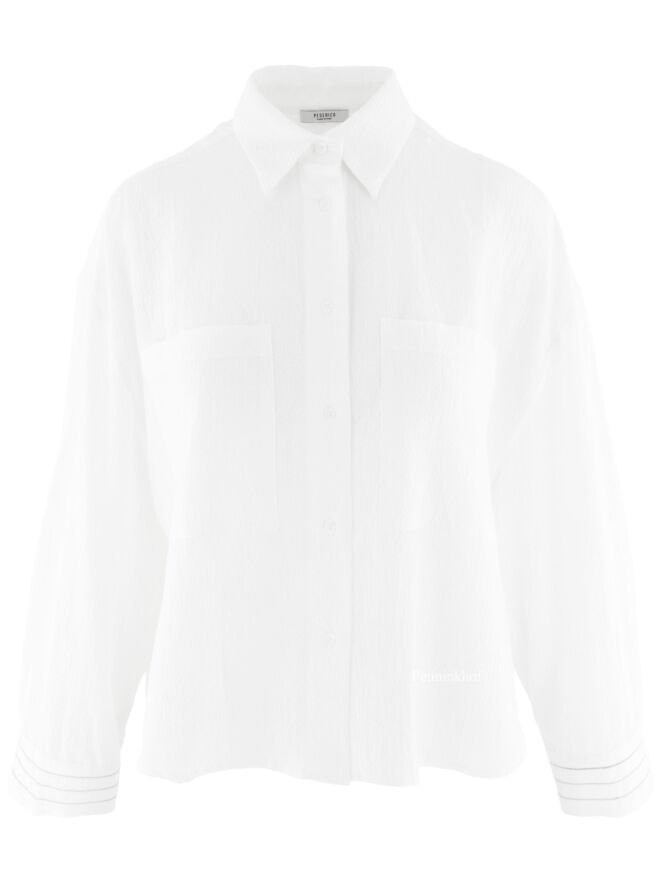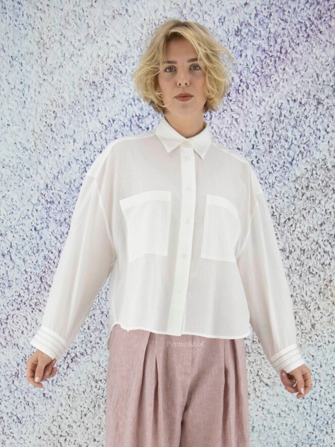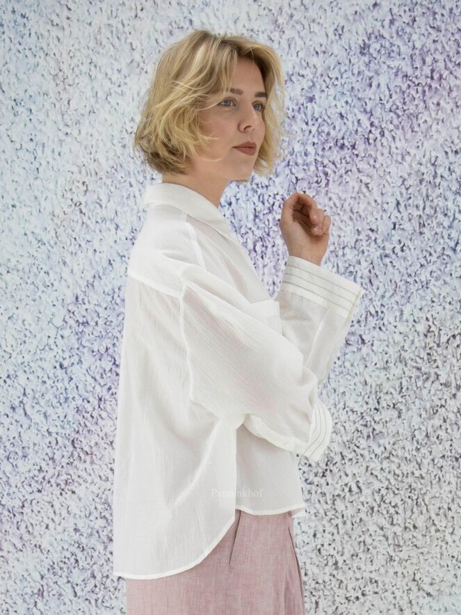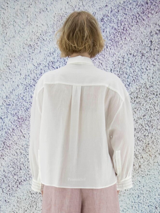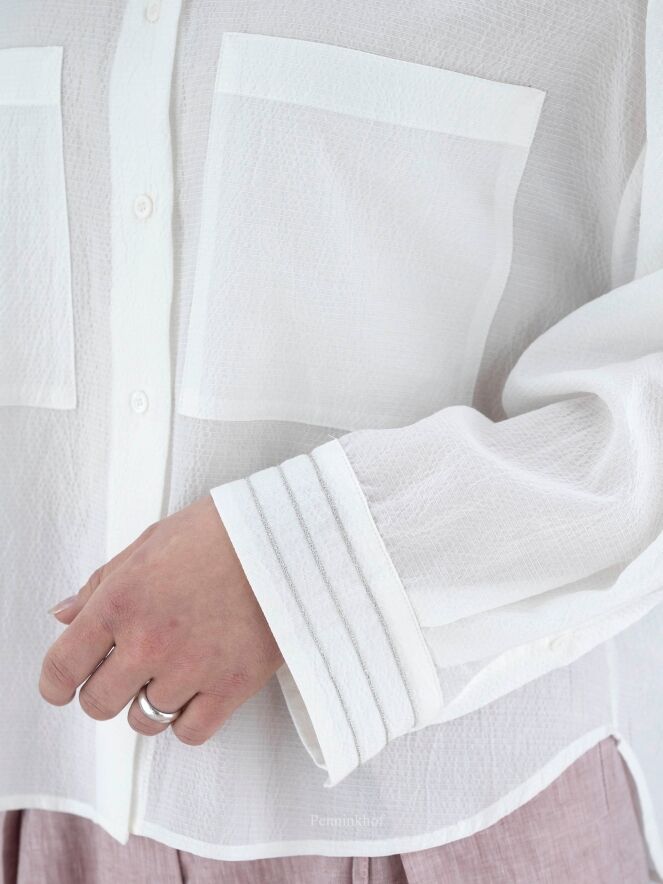 A luxurious slightly transparent blouse from Peserico in a soft crepe quality in the color white. In the cuffs of the long sleeves are several silver colored rhinestones. This blouse should not be washed.