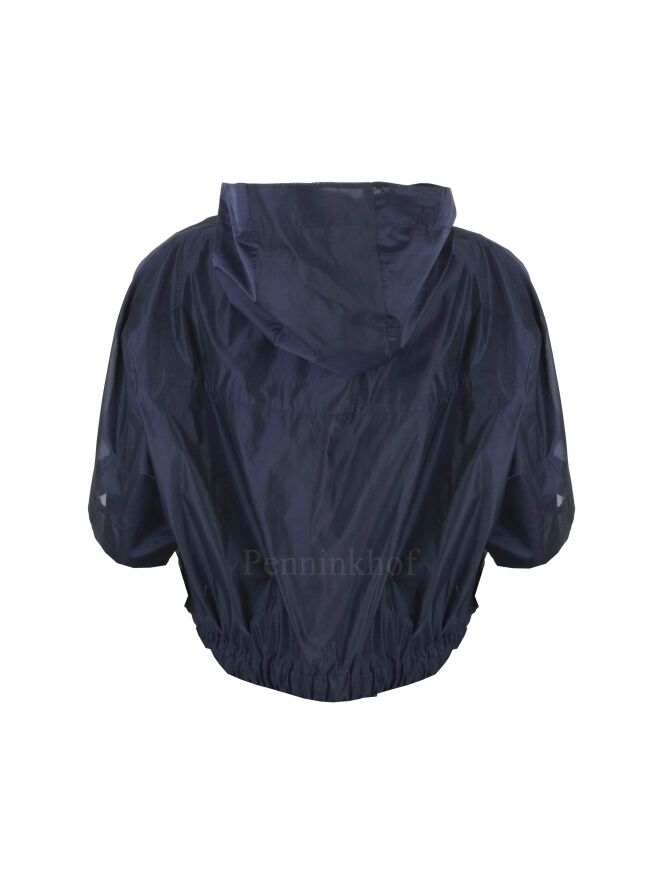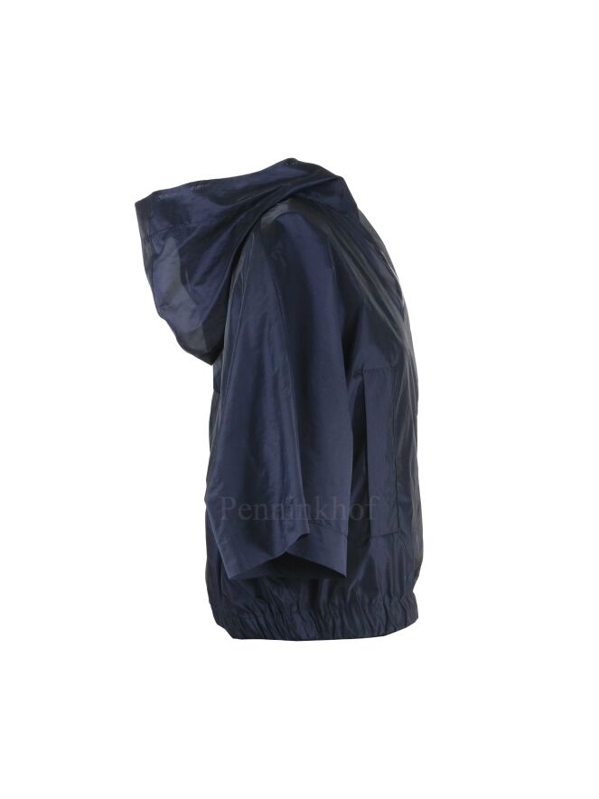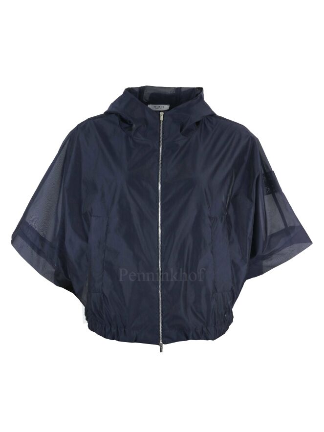 A transparent cardigan from Peserico in the color navy blue. The cardigan has a hood, bat sleeves and side pockets. At the bottom is a finely pleated elastic waistband. This vest should not be washed.