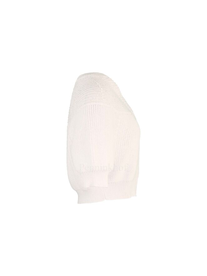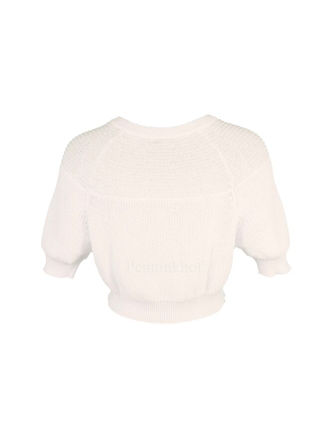 A short cardigan from Peserico in a creamy white color. The cardigan has one closure with a press stud just below the V - Neck. above the bust there are sequins in the fabric in a platinum color. At the bottom and at the end of the short sleeves is a tricot collar. This vest can be hand washed.