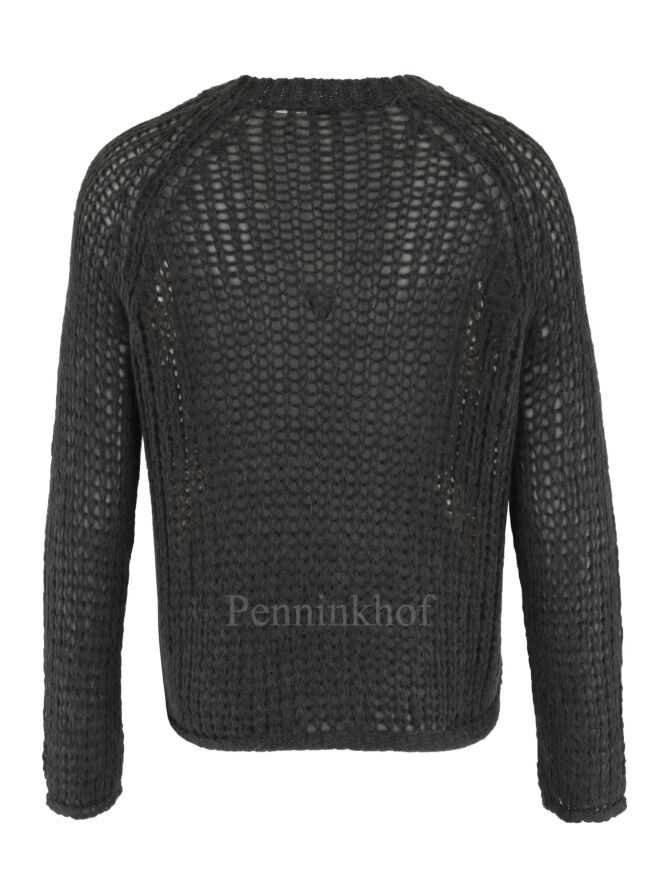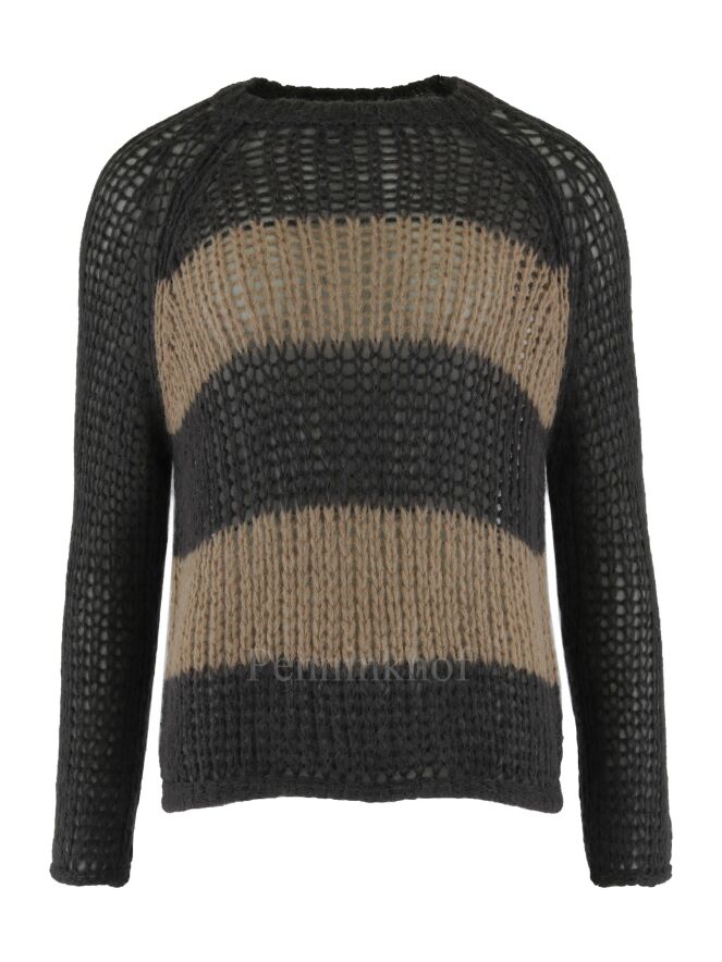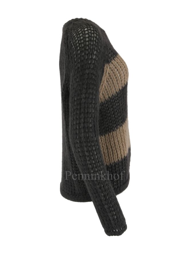 An open knitted pullover from Peserico with a striped pattern on the front in the colors gray and camel. The back and the sleeves are in a uni gray color. The pullover has a round neck and can be washed by hand.