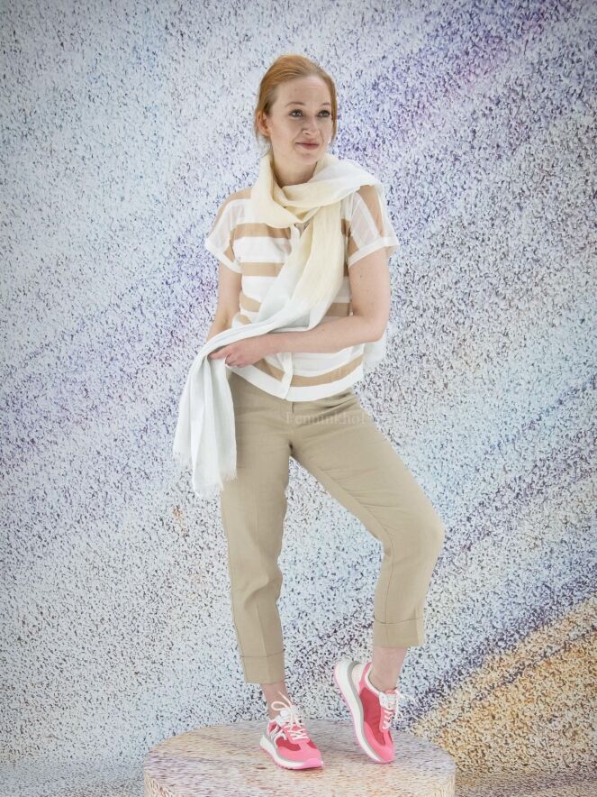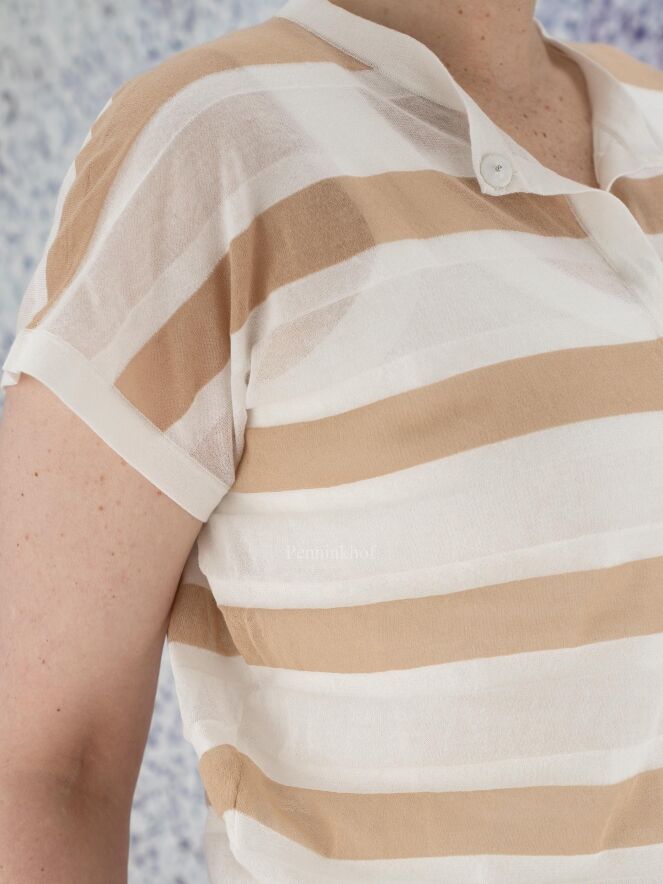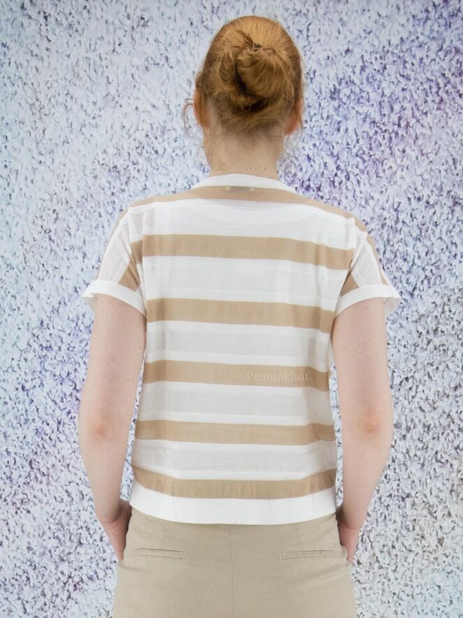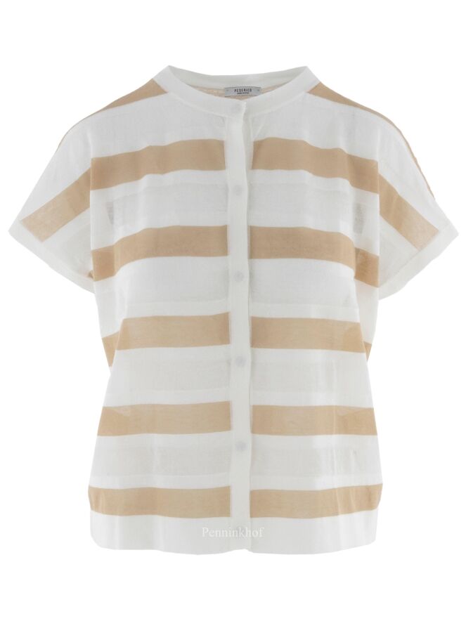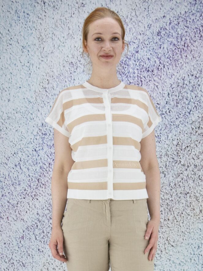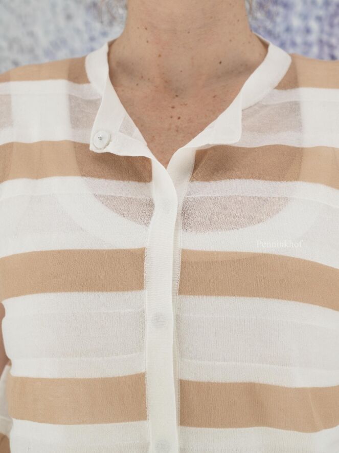 A slightly transparent cardigan by Peserico in a striped structure with the colors beige and white. The cardigan has a cap sleeve and can be washed by hand.