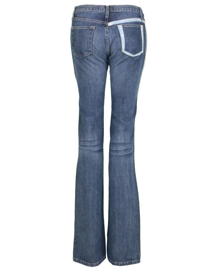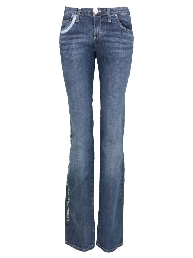 A washed jeans from Pianura Studio in a jeans blue color. Along the side of the right leg is a double trim in a creamy white color. Below the knee, the piping changes into a text. These jeans can be washed at 30 degrees.