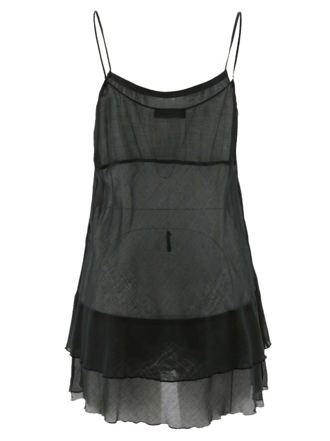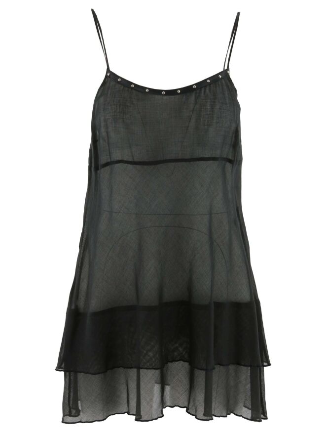 A transparent top from Pianura Studio in the color black. The top has spaghetti straps and along the edge above the bust is an imitation leather trim with silver colored round studs. At the bottom is a double fabric. This top can be washed by hand.