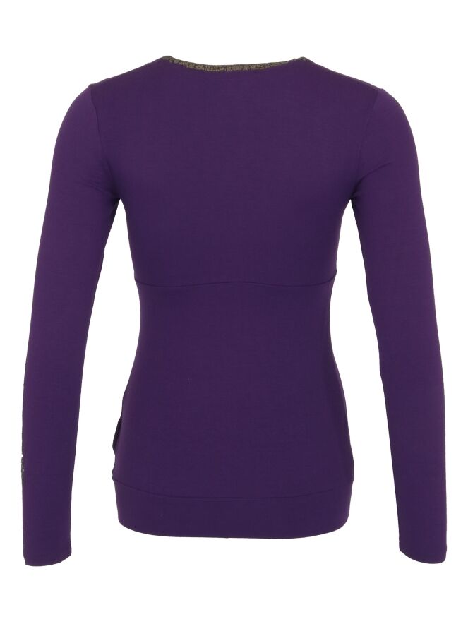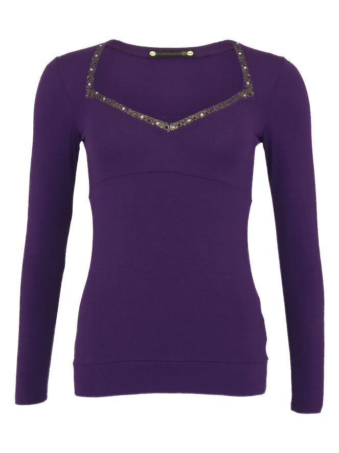 A shirt from Pianura Studio in the color purple. Along the edge of the neckline is a piping in a bronze-colored baroque print with rhinestones. This shirt can be washed at 30 degrees.