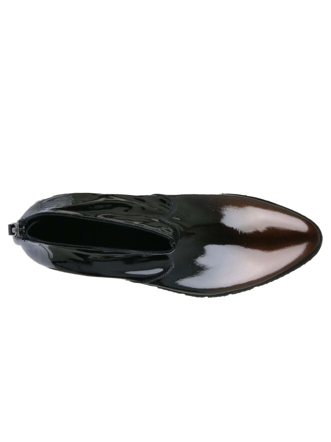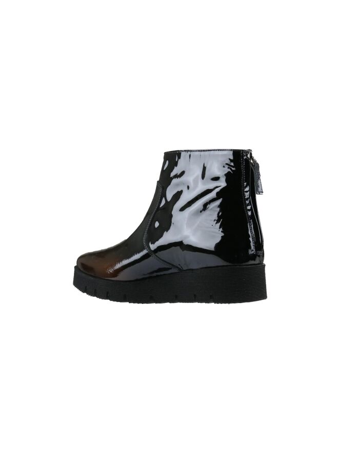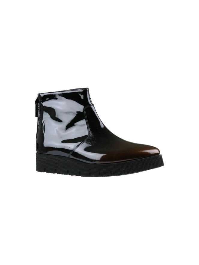 An ankle boot brand Pons Quintana in patent leather with a degrade color from black to bronze. On the heel is a zipper deployed. The coarse sporty sole is flexible.