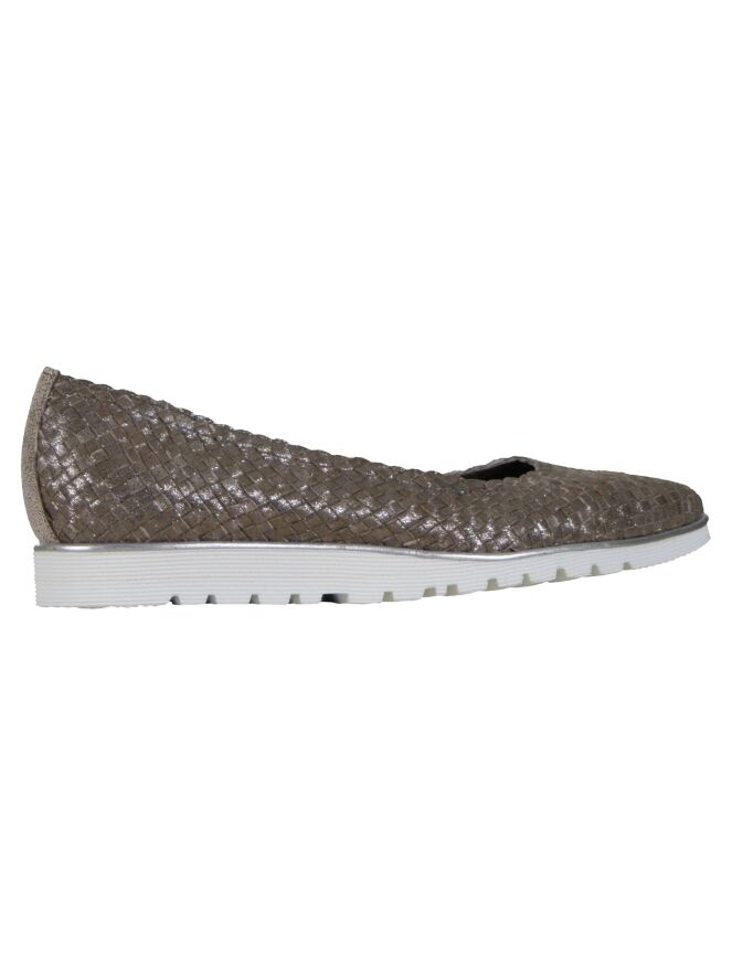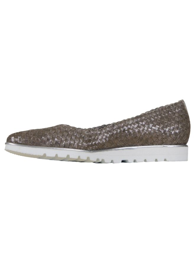 A ballerina by the brand Pons Quintana in the color taupe. The leather is braided and has a fine metallic look. On top of the white sole runs a fine silver band.