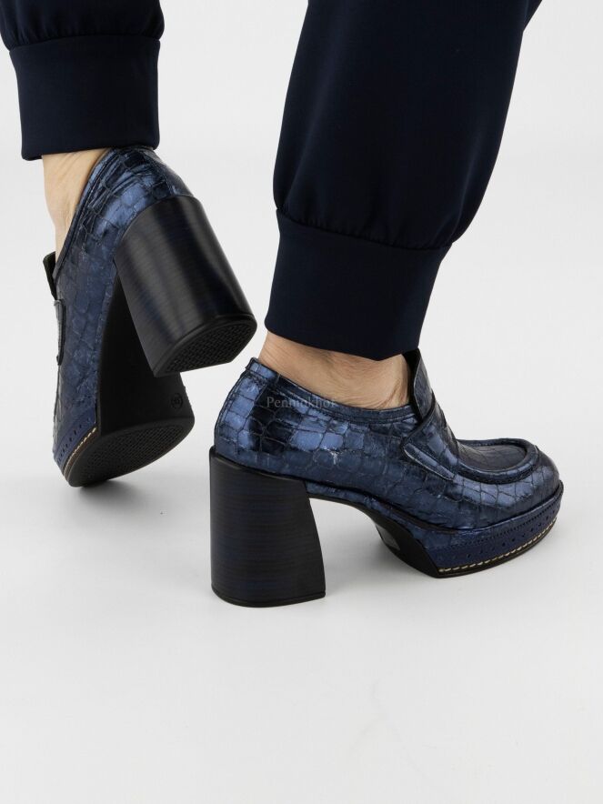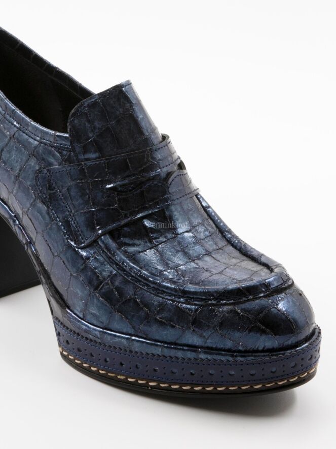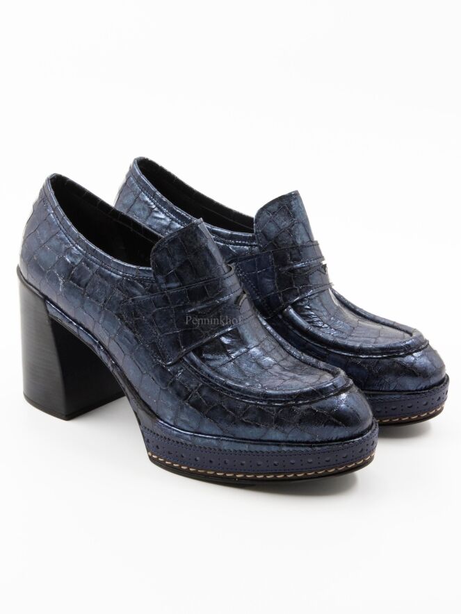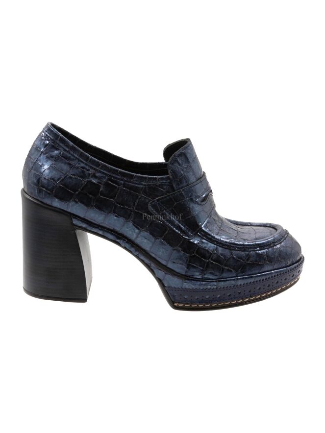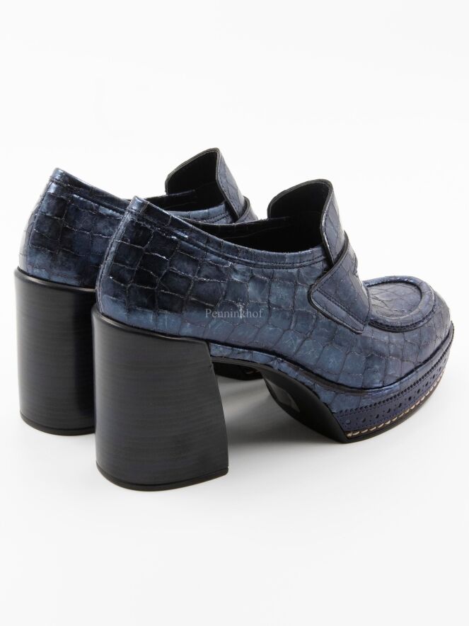 An instep on a high block heel from Pons Quintana in a croco print in petrol blue. The block heel is in a neutral black colour. Along the edge at the bottom of the platform sole is a decorative stitching seam. The inside is lined with leather.