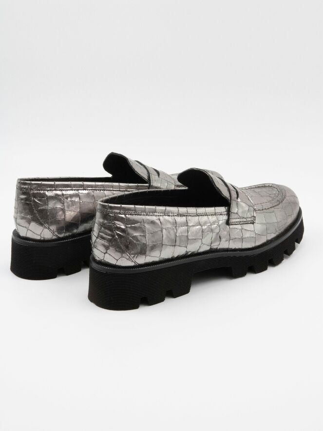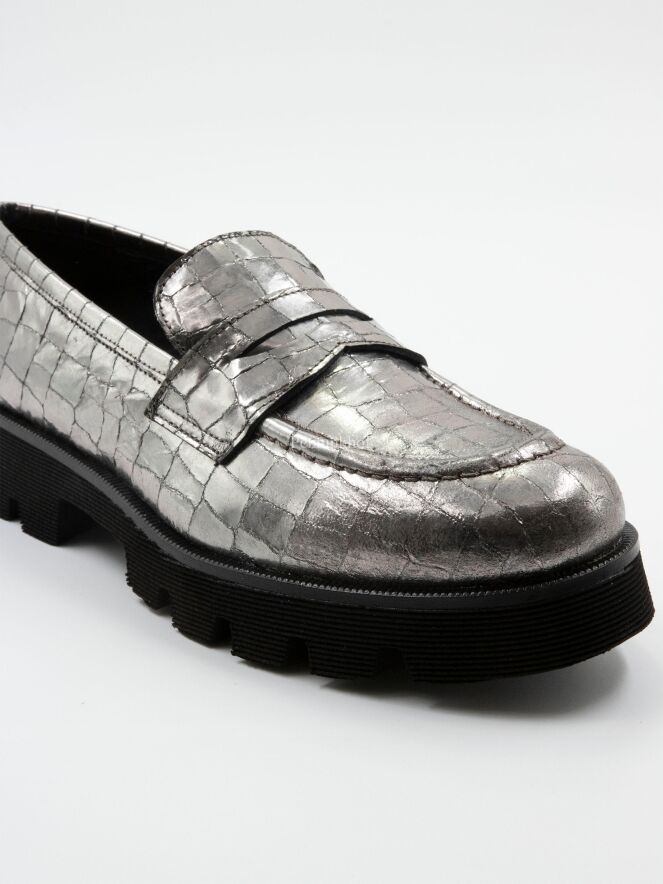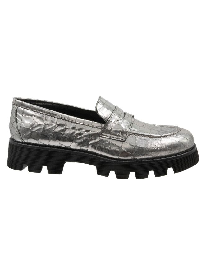 A loafer from Pons quintana in a silver croco print. The black sole is coarsely ridged. The inside of the loafer is lined with leather.