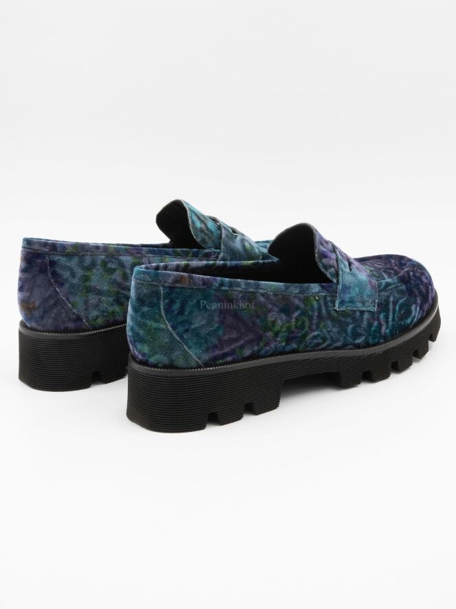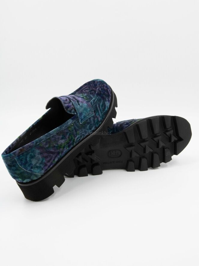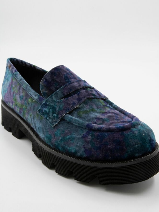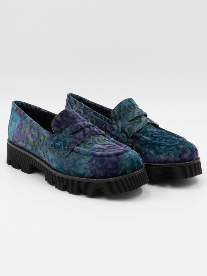 A loafer from Pons Quintana in a velour quallity featuring a graphic print with multiple shades of purple, turquoise and green. The black sole is coarsely serrated and the interior is lined with leather.