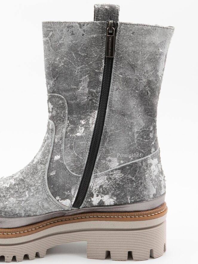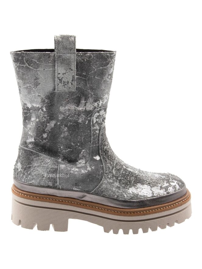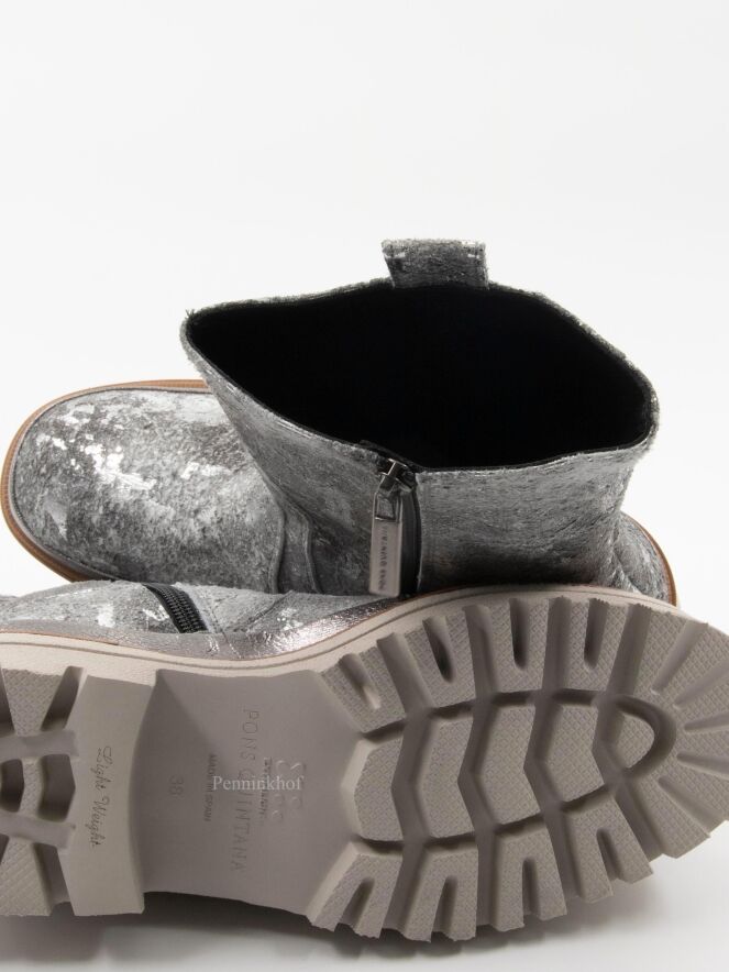 A mid-height boot from Pons Quintana in a scuffed leather with multiple shades of silver and grey. The platform sole is in multiple shades of grey with a camel-coloured trim with a decorative stitching.