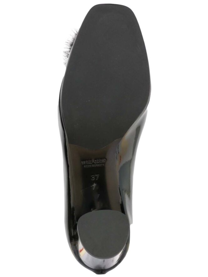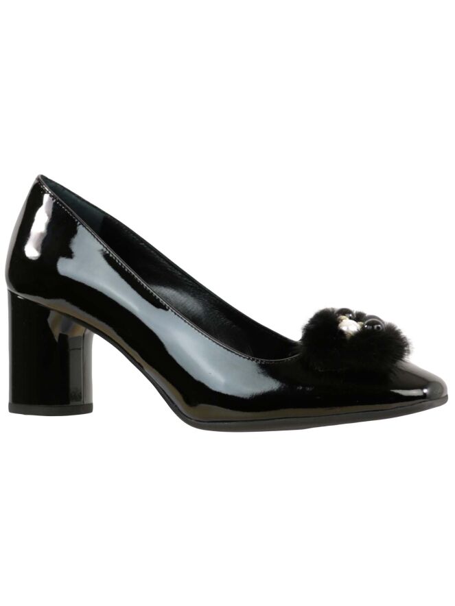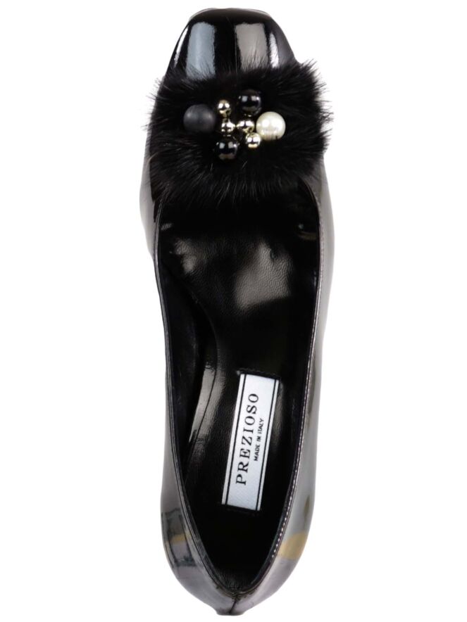 A pump in patent leather leather by the brand Prezioso in a black color. The pump has a rounded square toe. On the front foot is a decoration of imitation fur with pearls in the colors silver, black and gold. The elegant block shack is coated in the same material as the pump. The inside is lined with leather.
