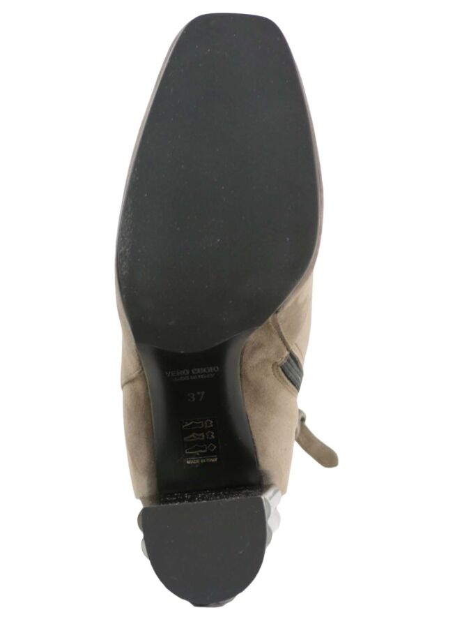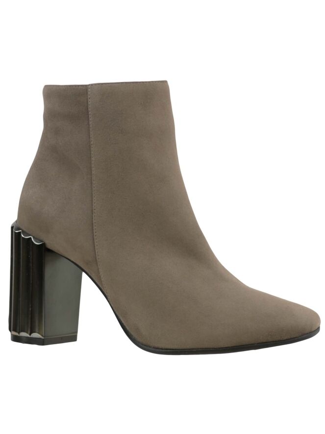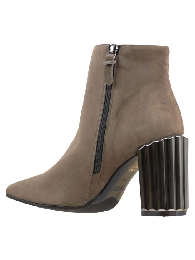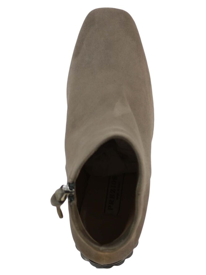 An ankle boot of the brand Prezioso in a taupe color. The boot has a rounded square toe. The decorative block schack has a ribbon pattern. On the inside of the ankle boot is a zipper handled. The inside is lined with leather.