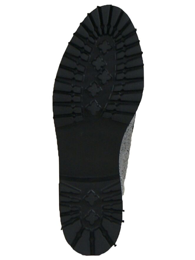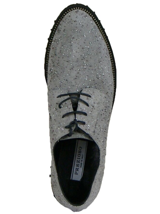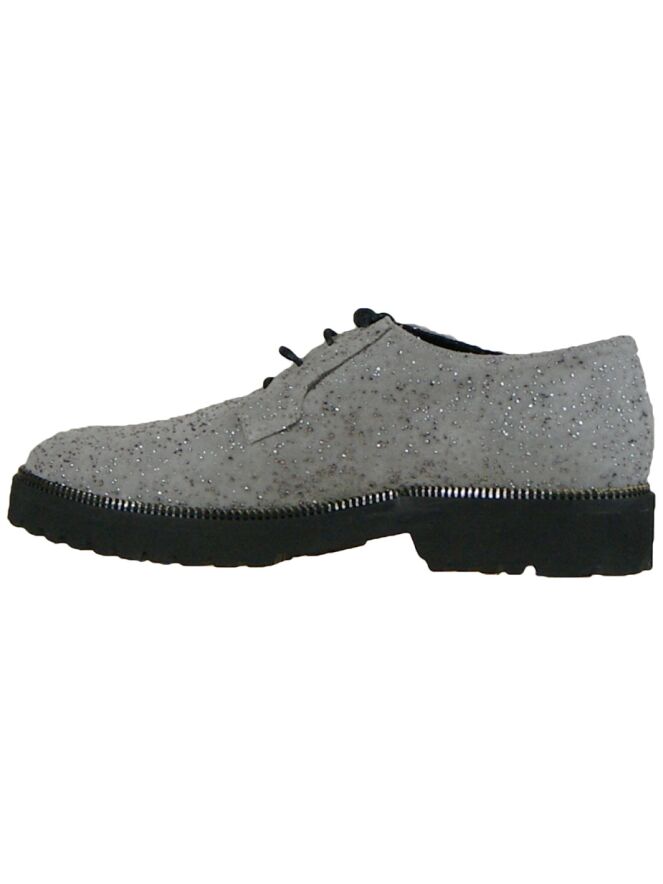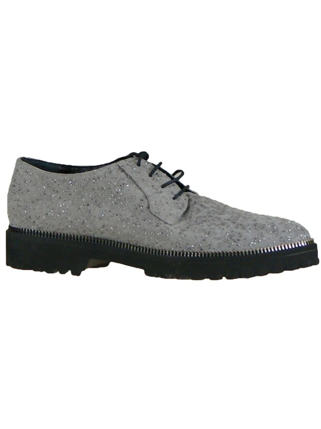 A shoe of the brand Prezioso in a color gray / taupe. Over the entire shoe are fine rhinestones processed. Along the coarse sporty sole a zipper running is processed. The shoe is lined on the inner side with leather.