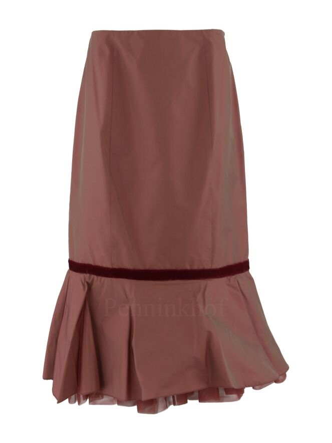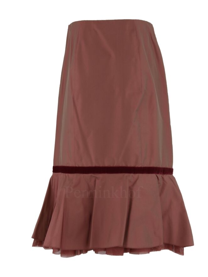 A matt shiny skirt from Renato Nucci in a wine red color. At the height of the knee is a velvet trim from which the fabric is slightly pleated. At the bottom is a tulle fabric that comes out from under the skirt. This skirt should not be washed.