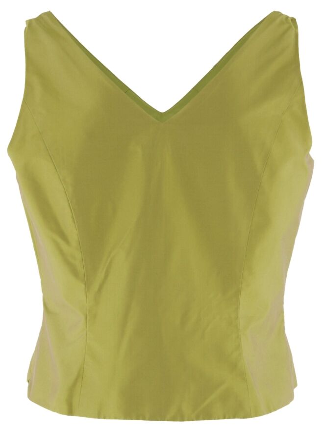 A top by Renato Nucci in a matte satin green color. The top has a V-neck at the front and back. This top should not be washed.