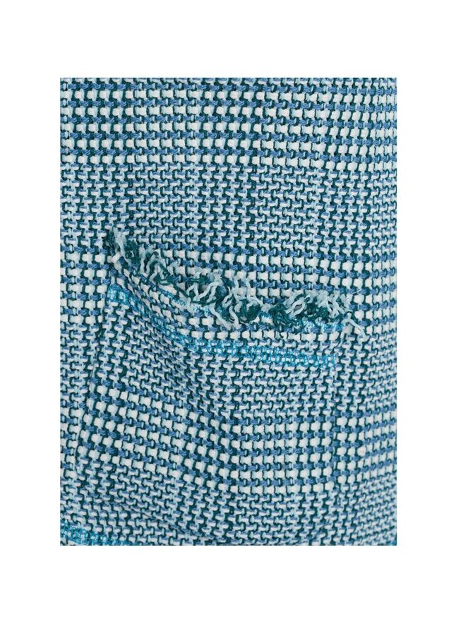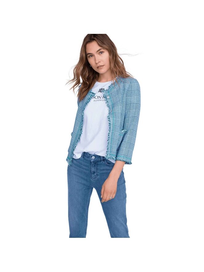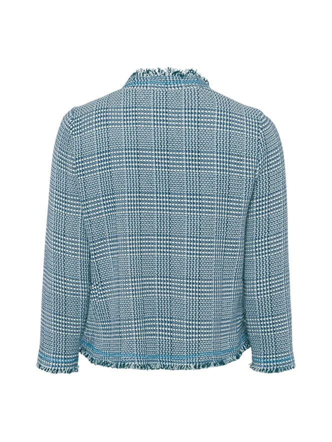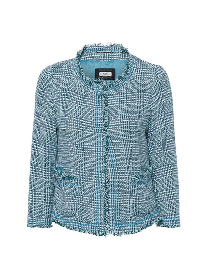 A chanel blazer from Riani in an ice blue color with white and emerald green. The edges of the blazer are finely frayed. This blazer is unlined and may not be washed.
