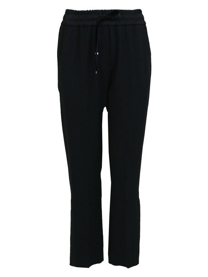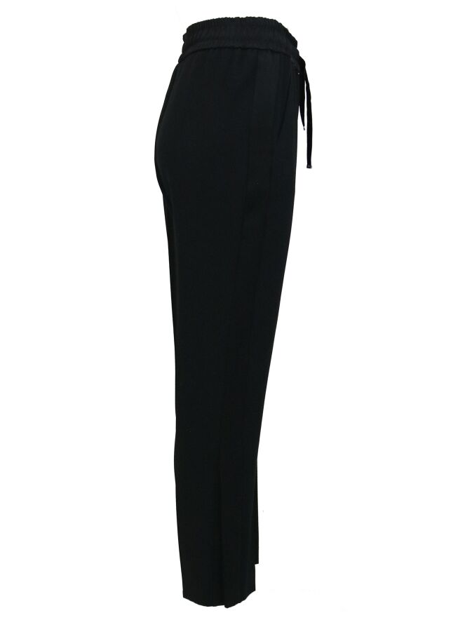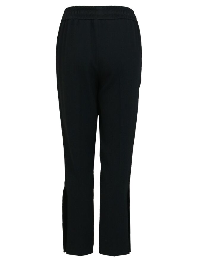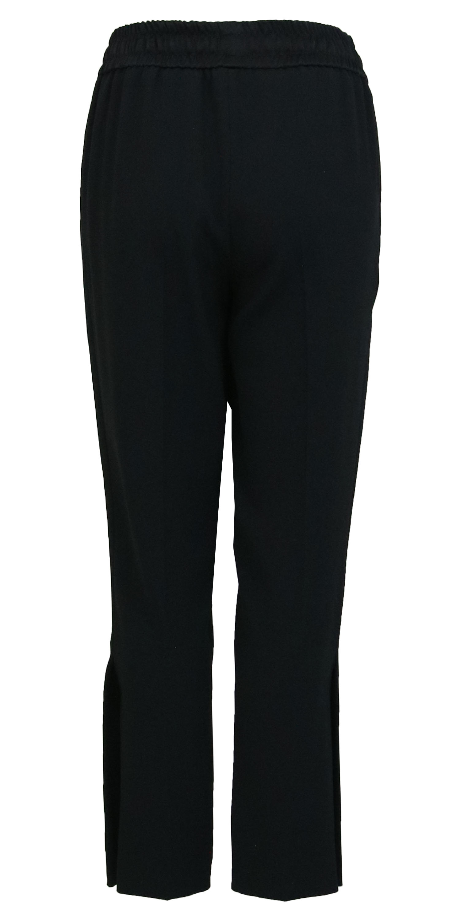 A pair of Riani pants in the color black. At the waist is an elastic matte satin and finely pleated band. On the sides is a wide matte satin trim and at the bottom is a deep split in the legs. The pants have side pockets and should not be washed.