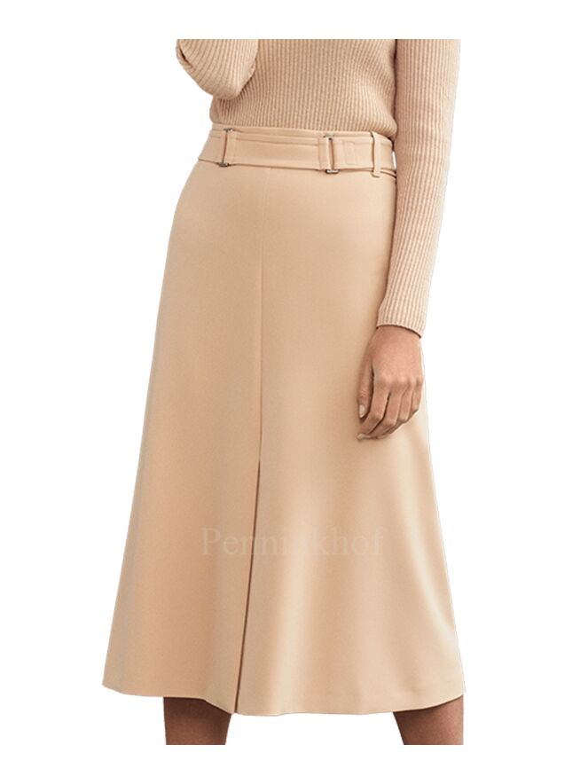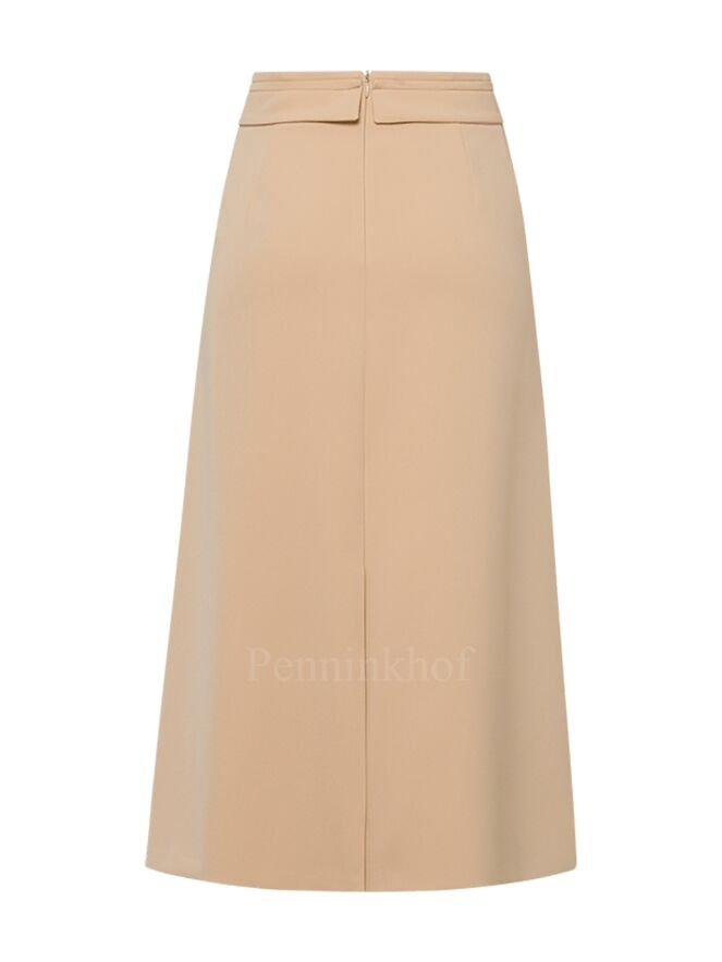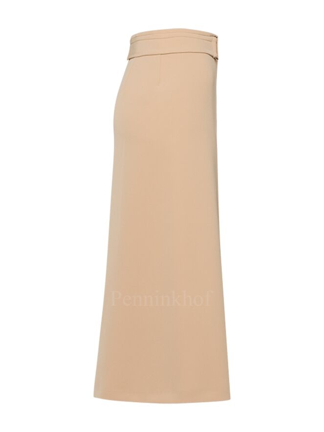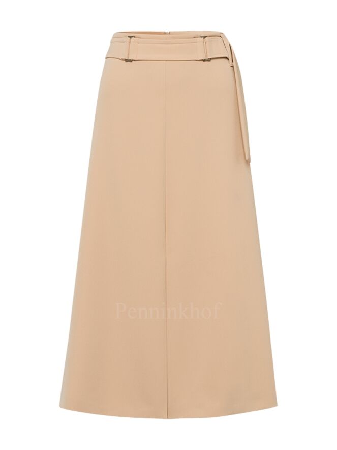 A skirt from Riani in a full sand color. The skirt has a light A-line with a split at the bottom in the middle at the front and at the back. At the waist is a wide belt. This skirt should not be washed.