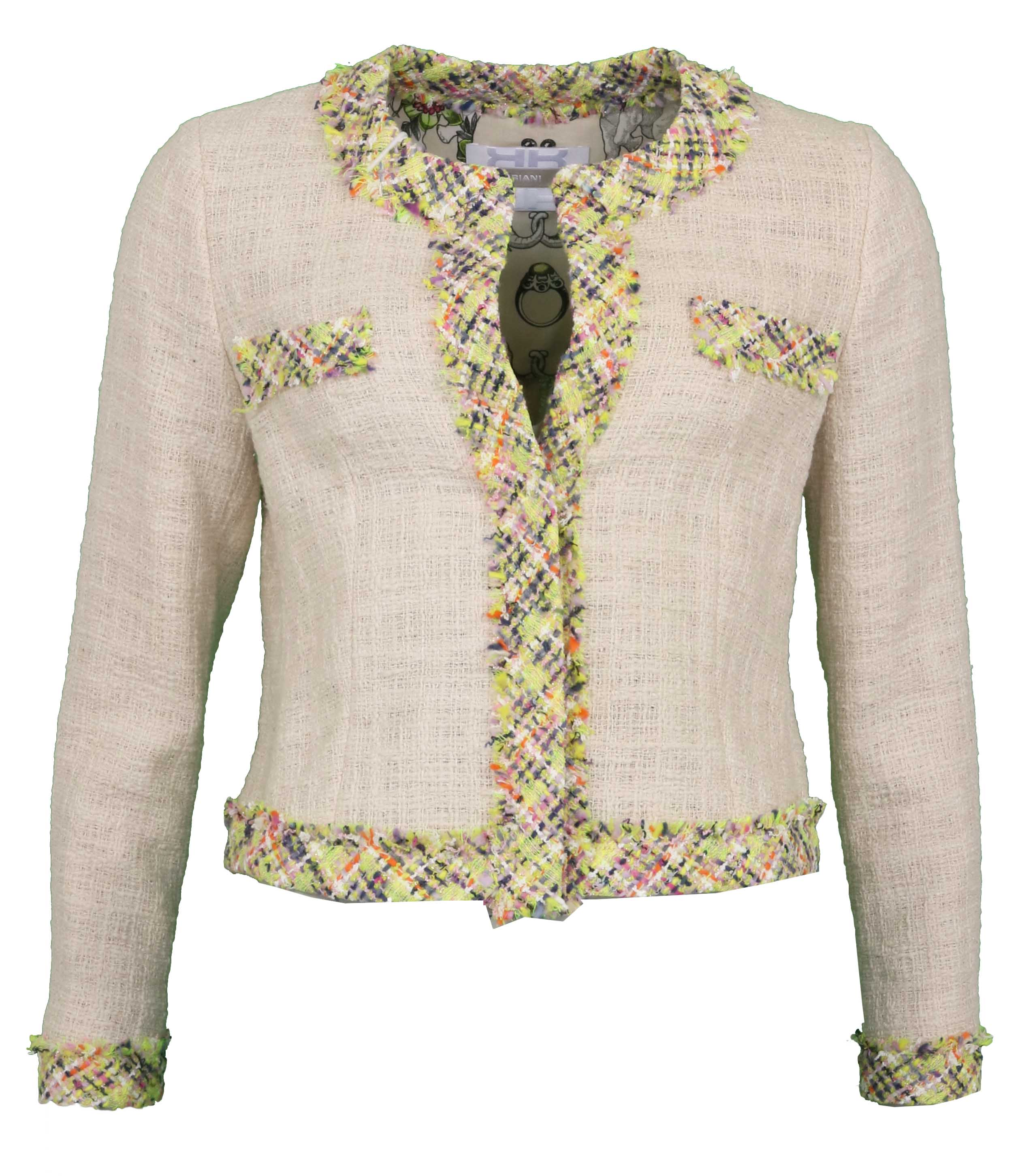 A short blazer by Riani in a sand color. Along the edges is a diagonal woven fabric in multiple colors with finely frayed ends. The blower has 3 snap fasteners and is unlined. This blazer must not be washed.