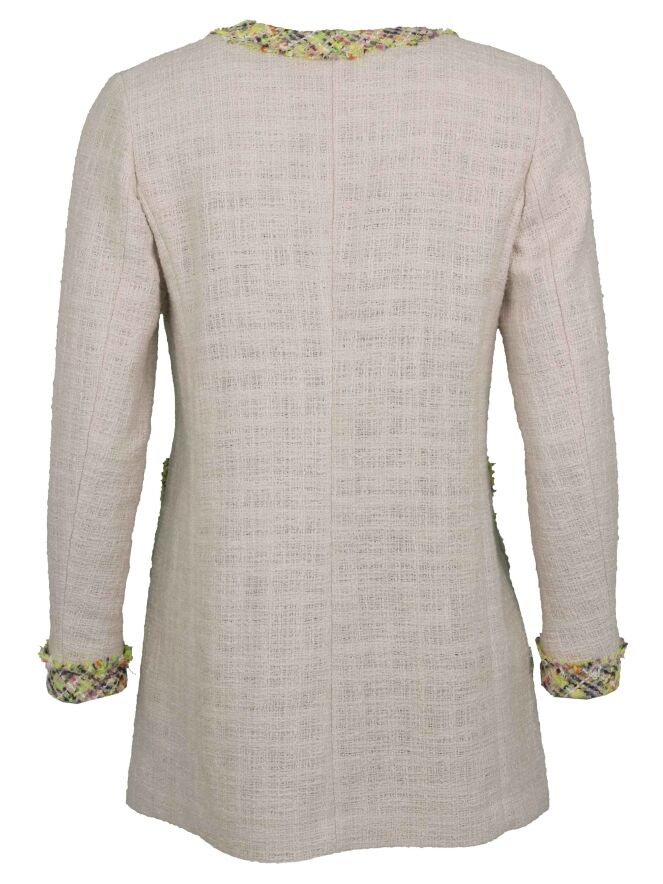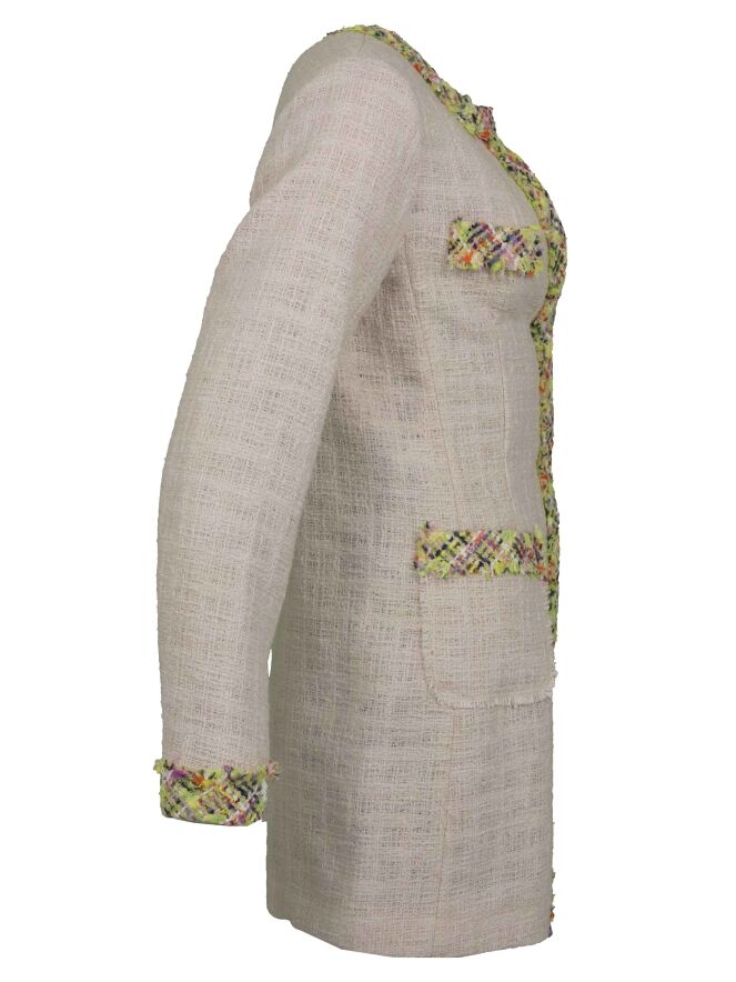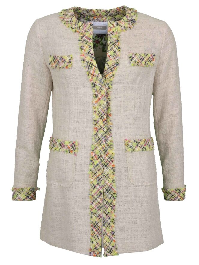 A long blazer by Riani in a sand color. Along the edges is a diagonal woven fabric in multiple colors with finely frayed ends. The blower has 2 snap fasteners and is unlined. This blazer must not be washed.