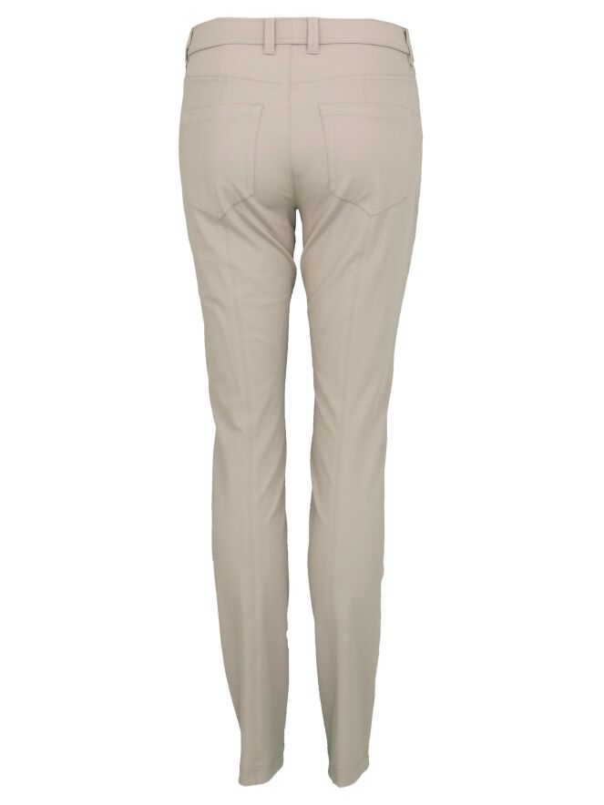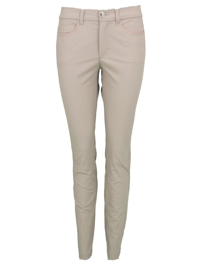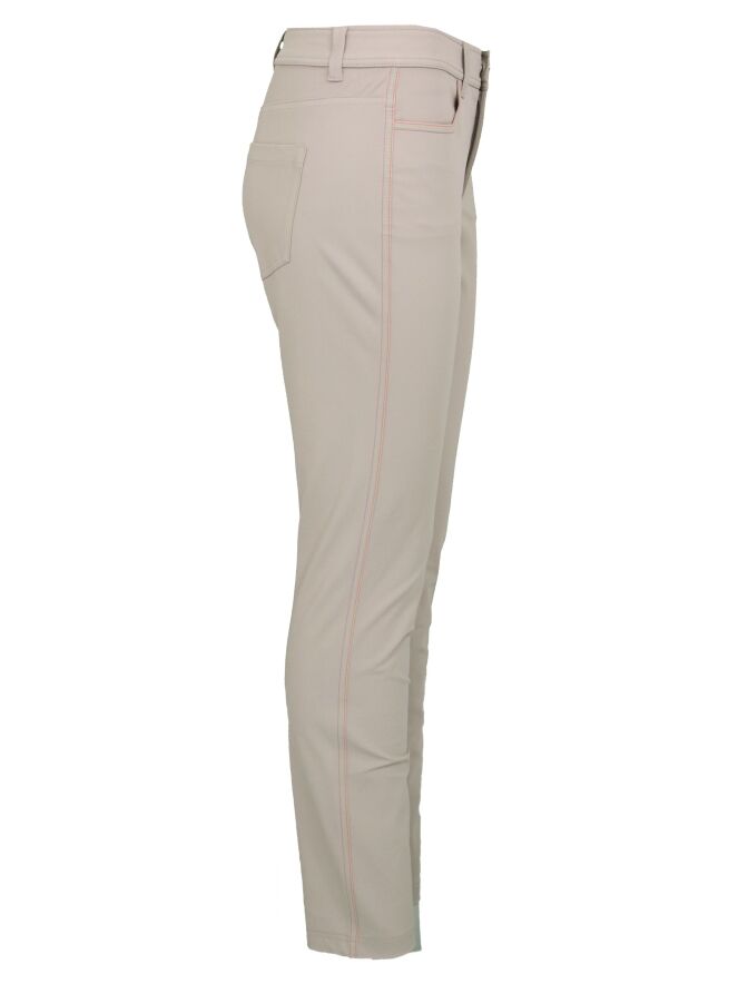 A trousers by Riani in a pastel khaky color. The stitching of the pants are in orange. The pockets have a round edge and these pants can be washed at 30 degrees.