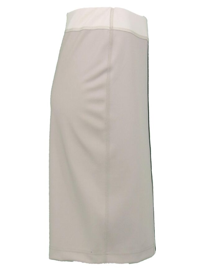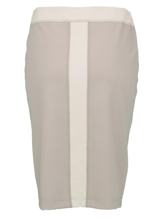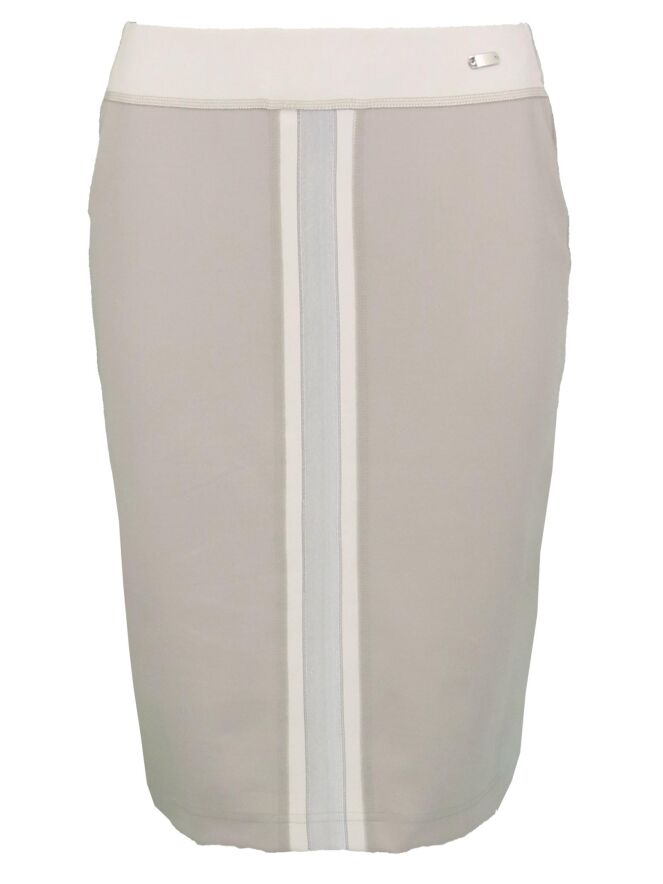 A skirt by Riani in a pastel khaky color with sand. At the waist is a 4 cm wide elastic band. In the middle of the front and back is a wide piping. On the front it is in a metallic fabric. The skirt is lined and falls just above the knee. This skirt can be washed at 30 degrees.