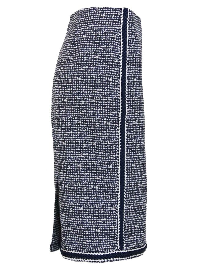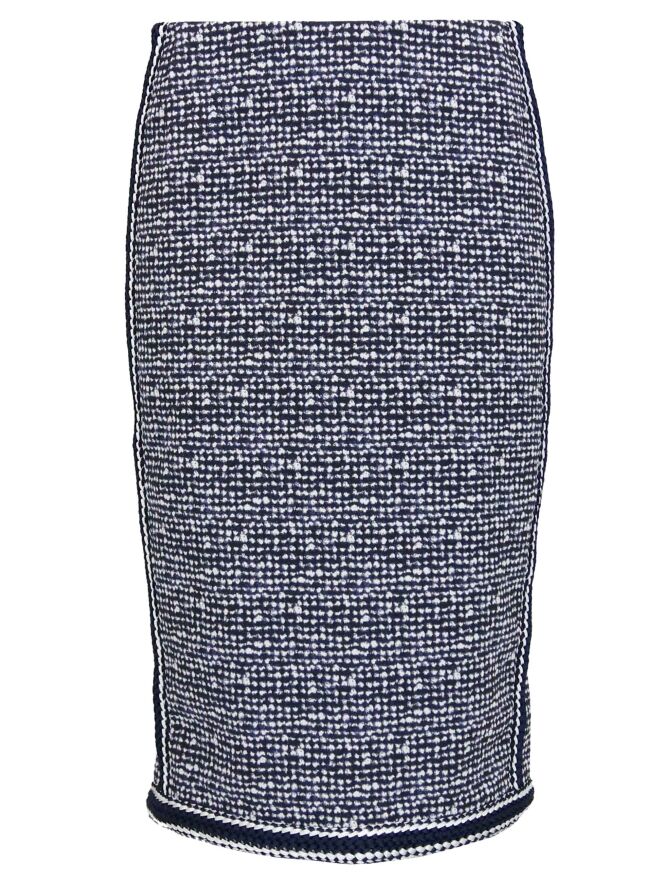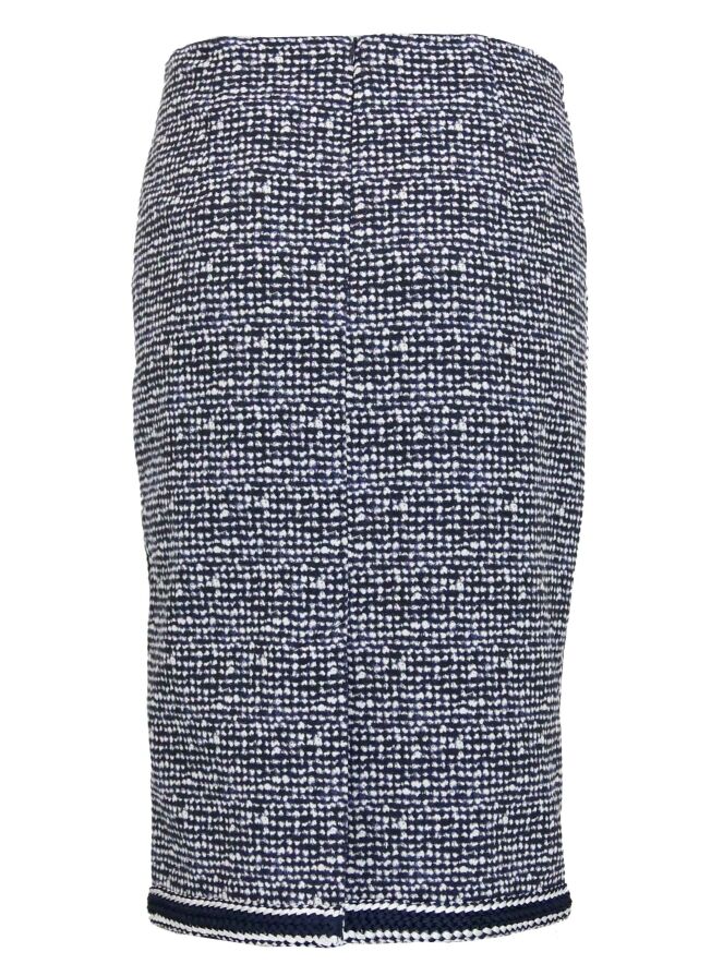 A skirt from Riani in a print with the colors navy blue, white and black. At the waist is an elastic band. Along the sides is a braided piping with the colors cream white and navy blue. This skirt may not be washed.
