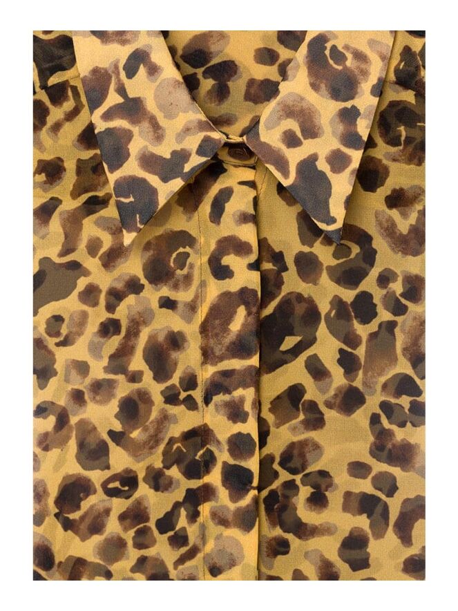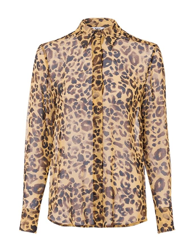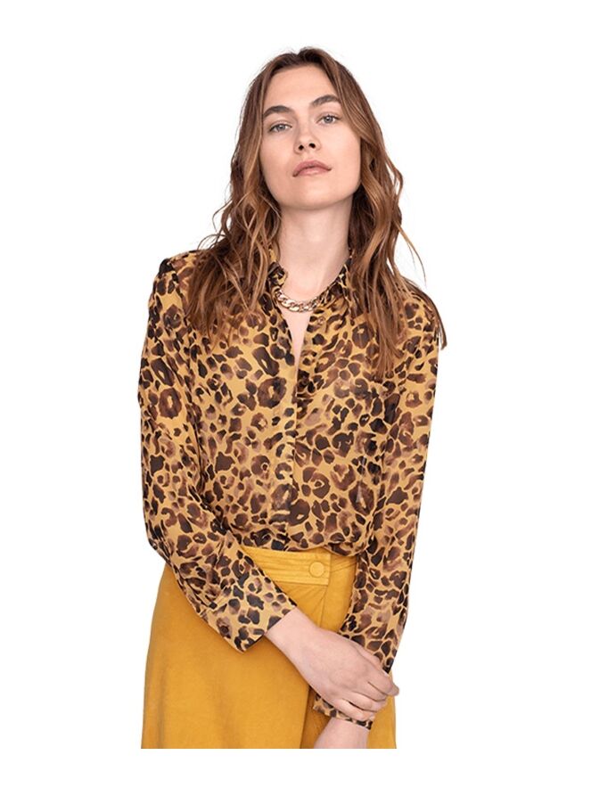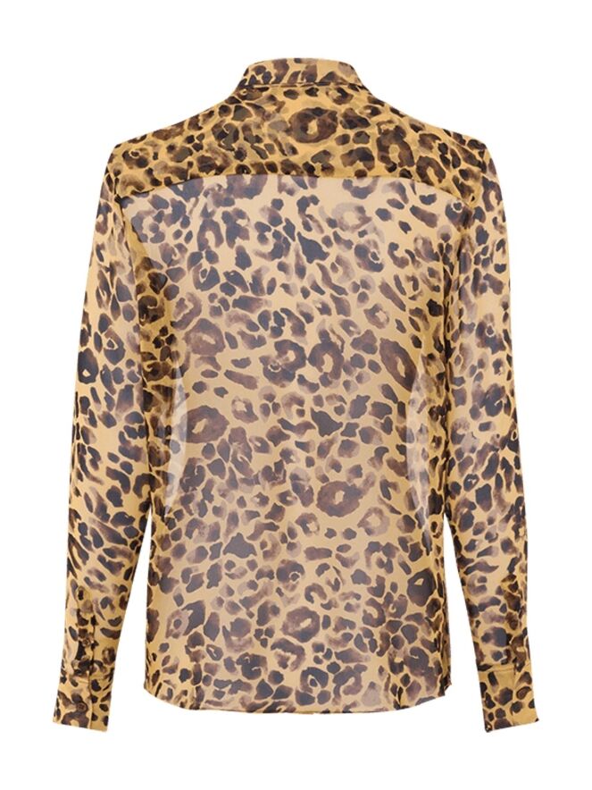A transparent blouse from Riani in a leopard print with the colors ocher yellow, black and multiple shades of brown. This blouse can be washed by hand.