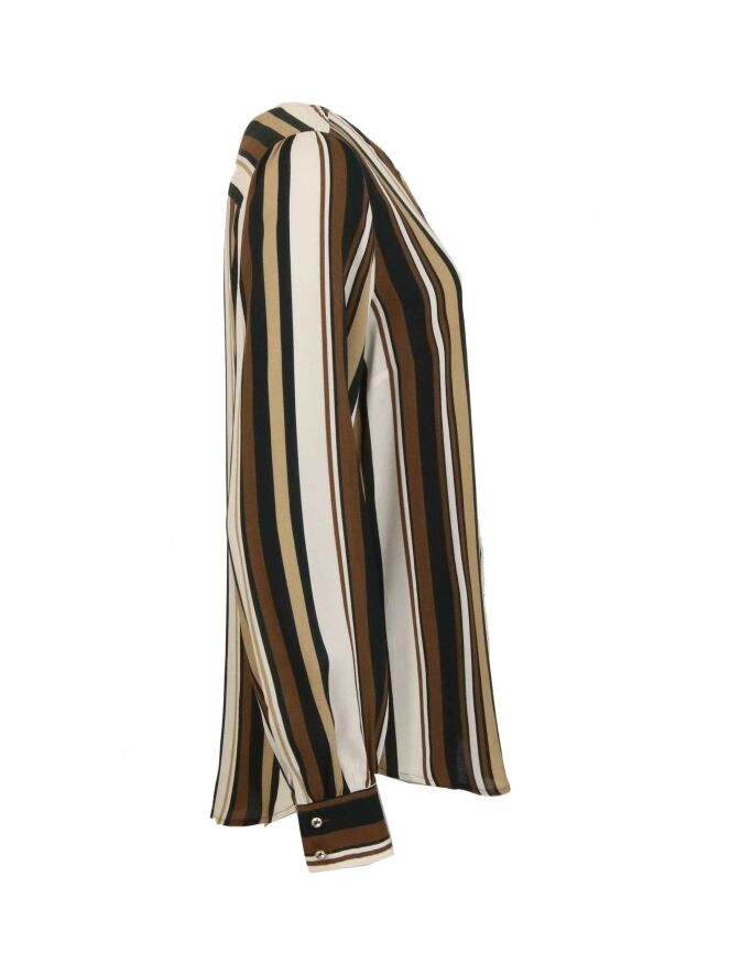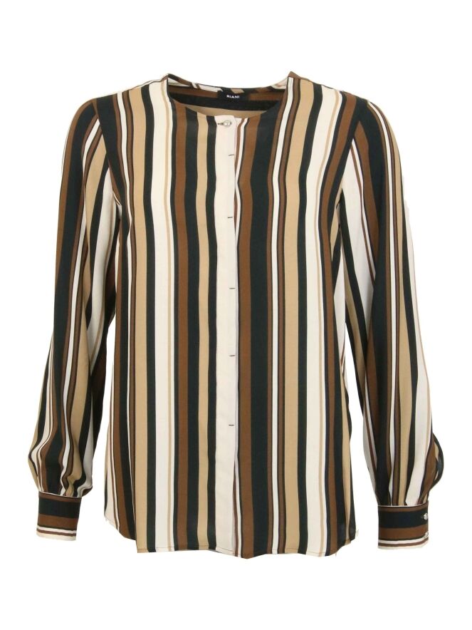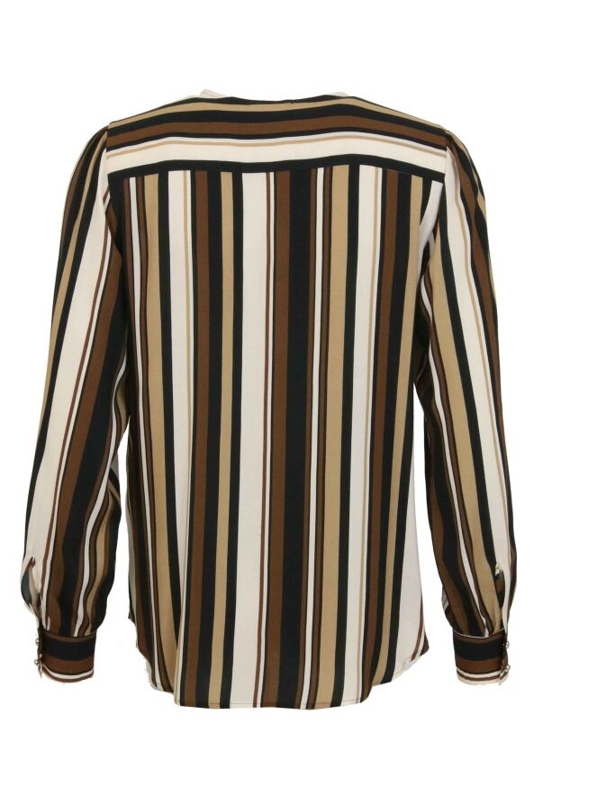 A blouse from Riani in a stripes print with the colors camel, black, brown and vanilla. This blouse can be washed on 30 tracks.
