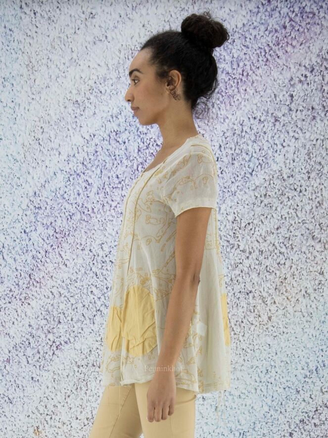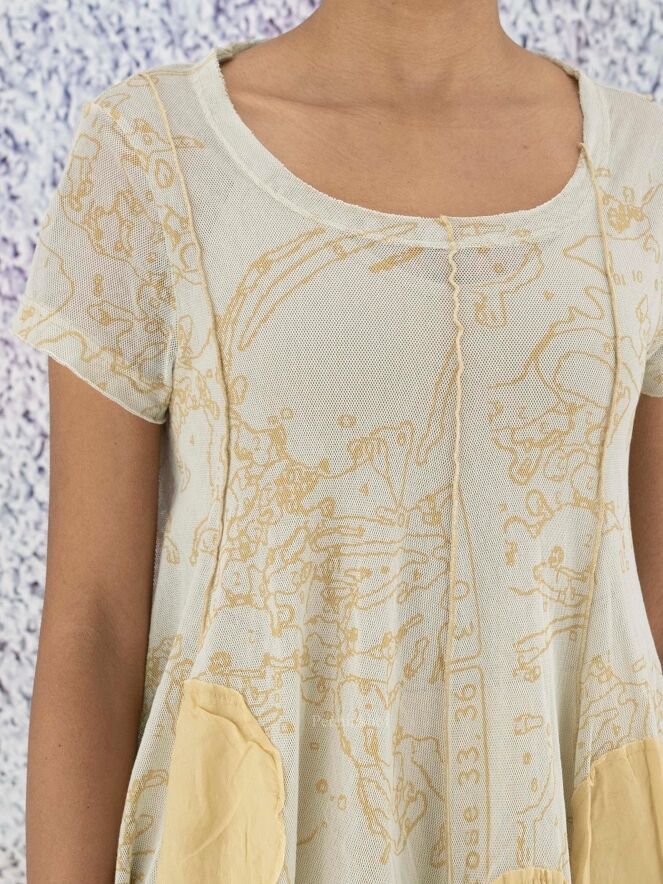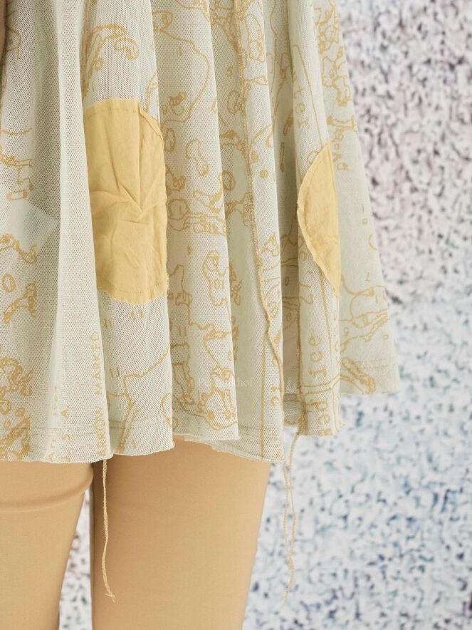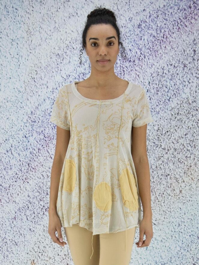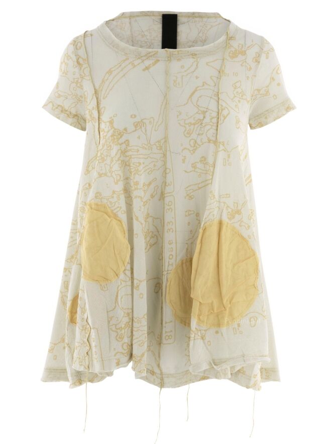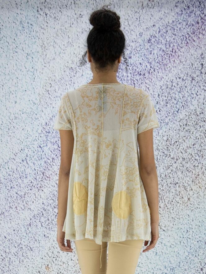 A slightly transparent shirt from Rundholz black label in a graphic print with balls in multiple sizes in multiple shades of ocher yellow. The shirt has a round neckline and short sleeves. At the bottom are several decorative loose threads. This shirt can be washed at 30 degrees.
