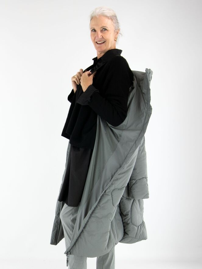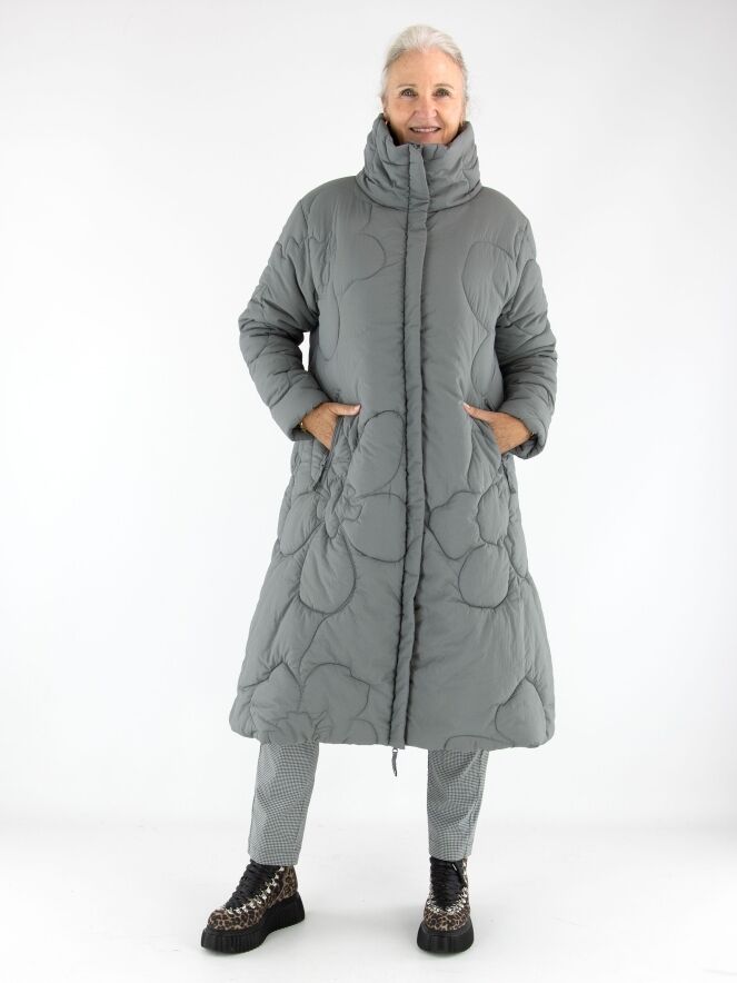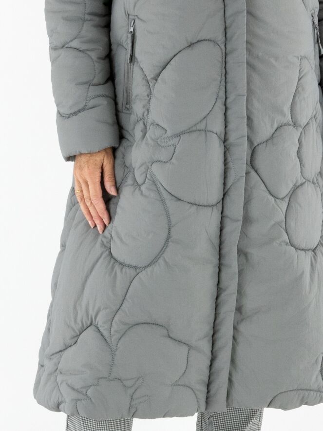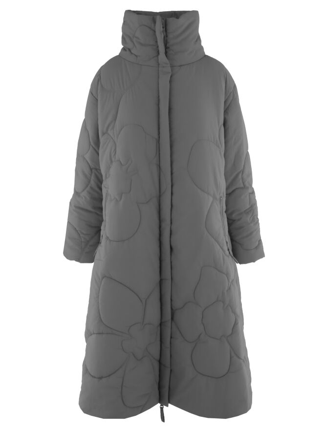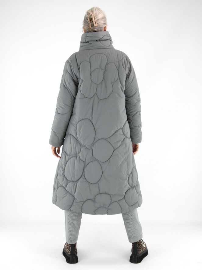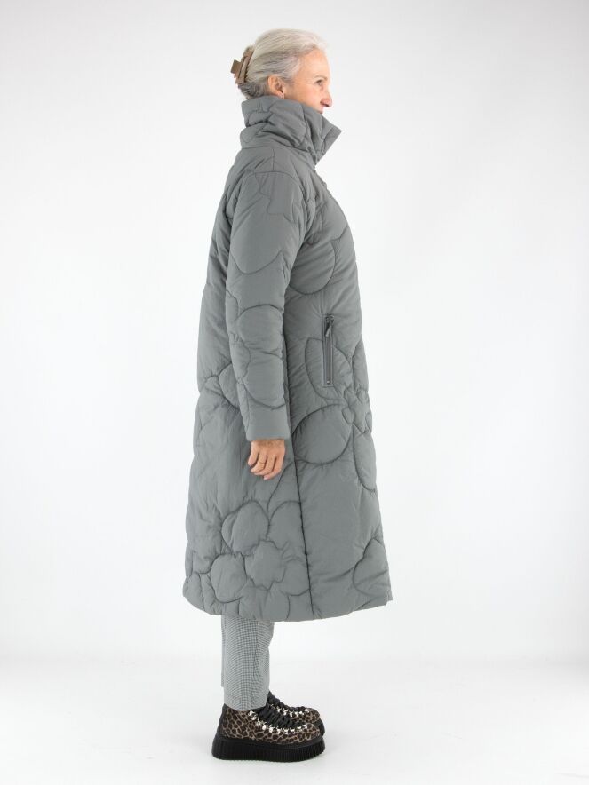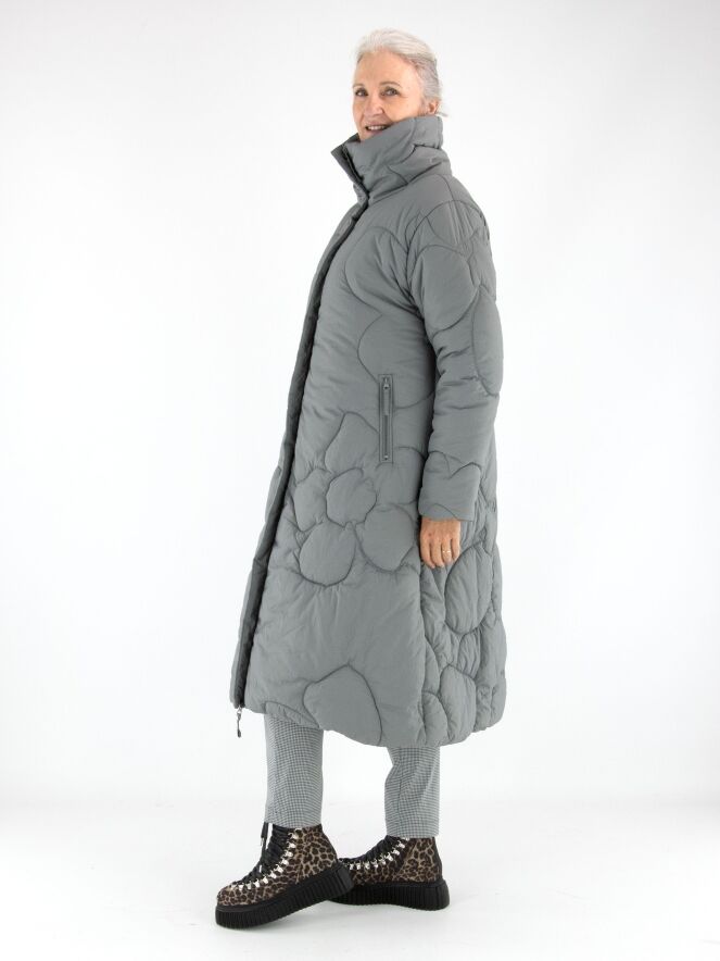 A long coat by Rundholz Black Label in grey. The coat is quilted in a floral pattern. The side pockets are finished with zip fastenings, and the closure of the coat is also designed in grey. This coat can be washed at 30 degrees.