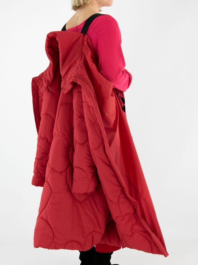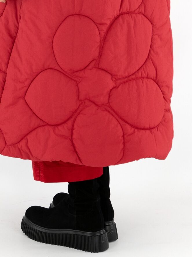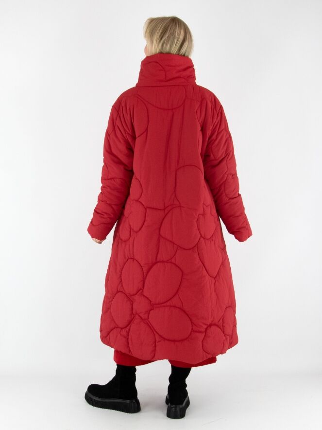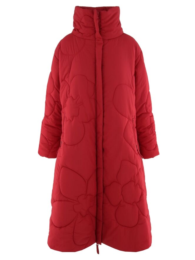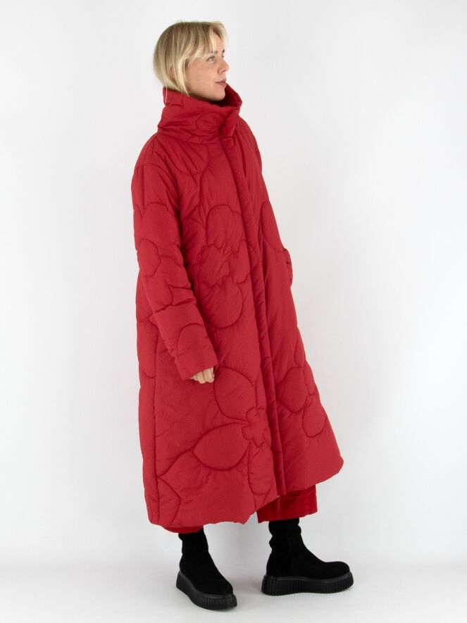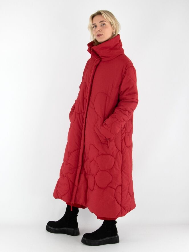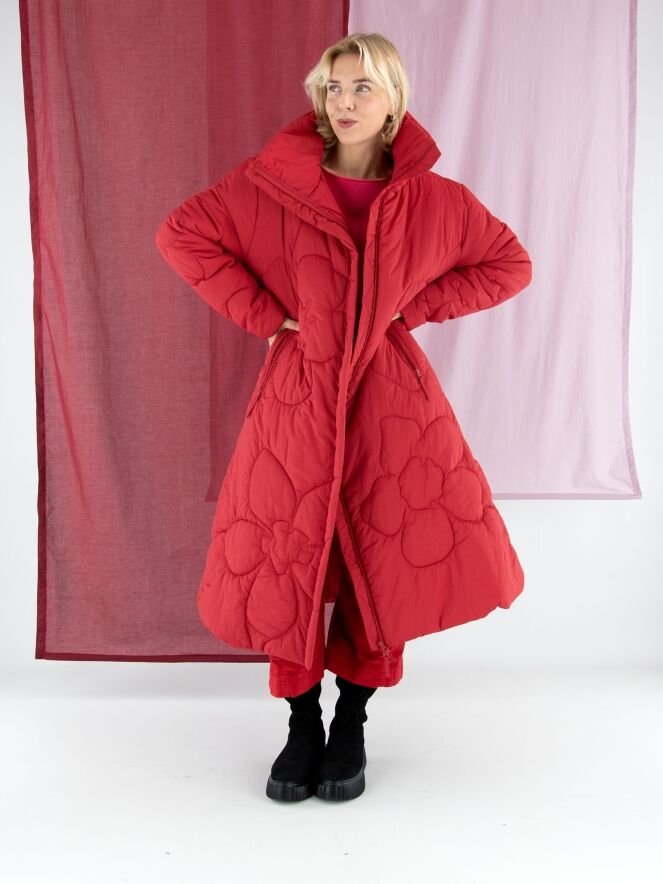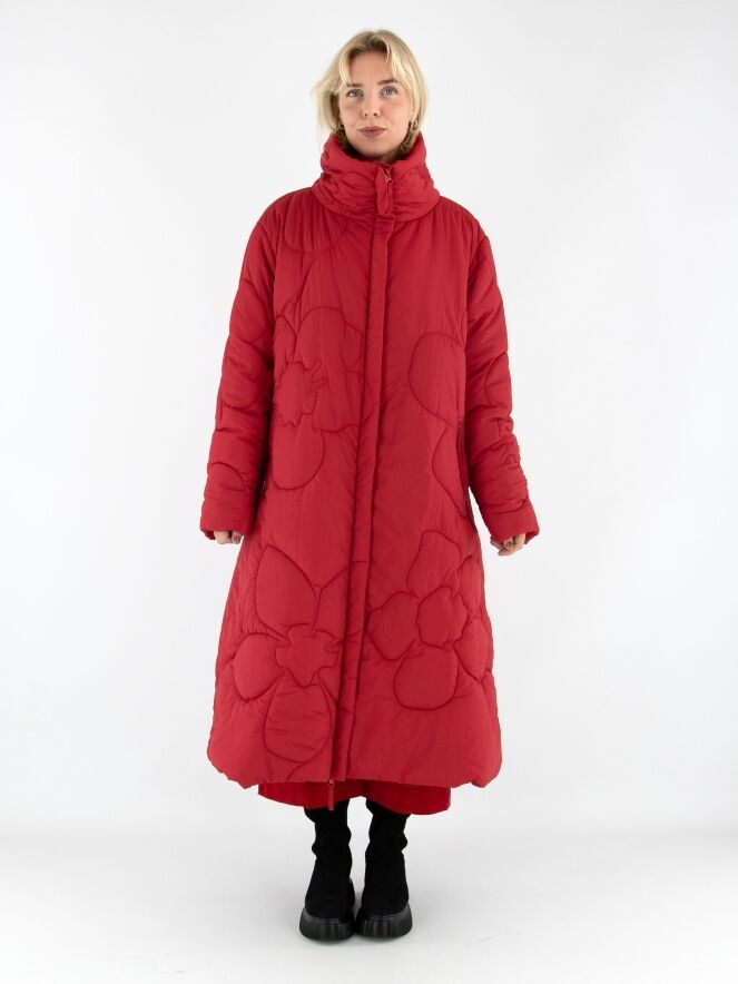 A long coat by Rundholz Black Label in red. The coat is quilted in a floral pattern. The side pockets are finished with zip closures and the front fastening is designed in grey. This coat can be washed at 30 degrees.