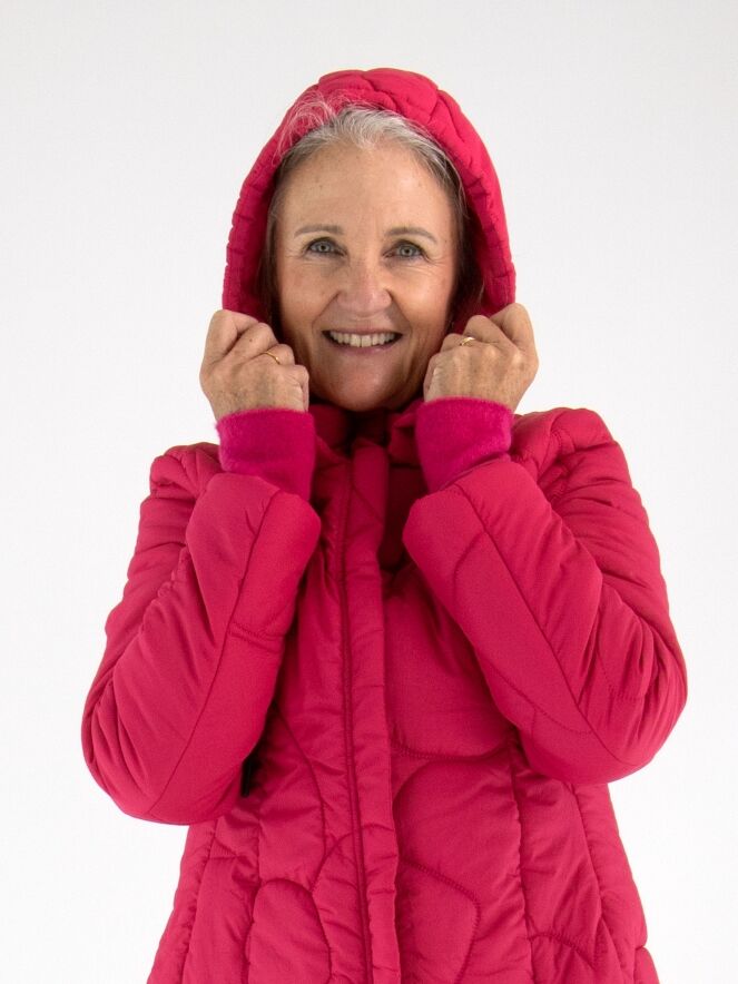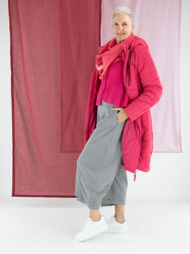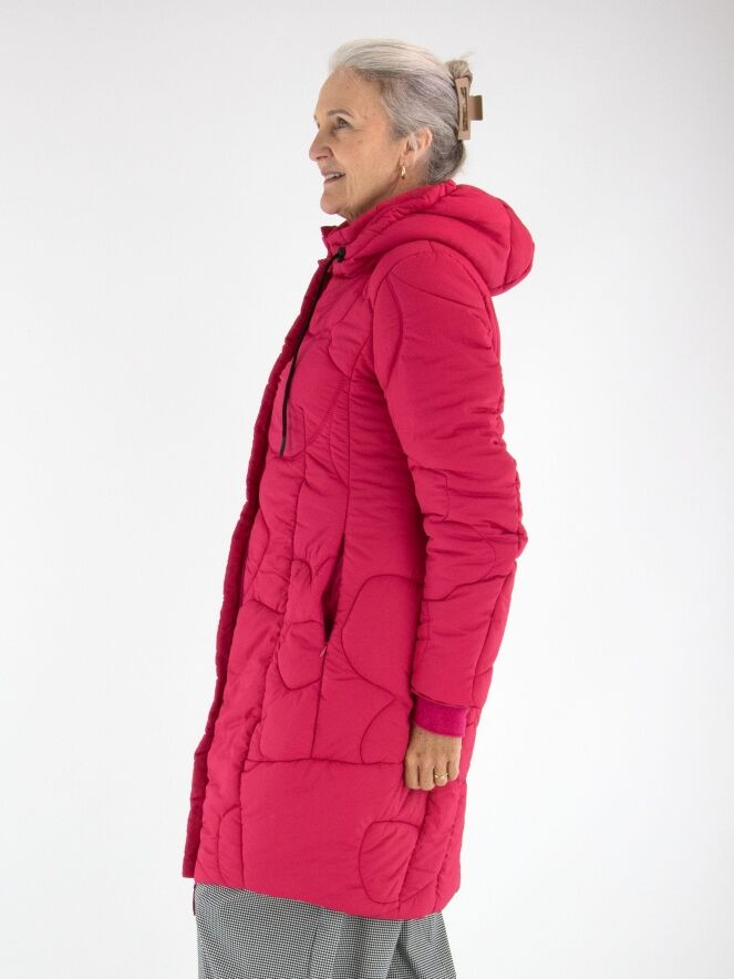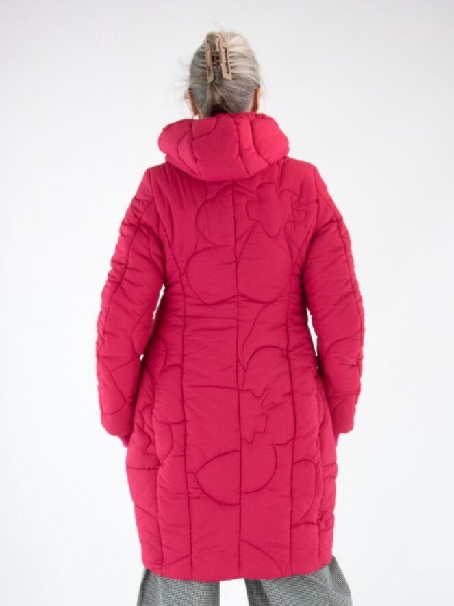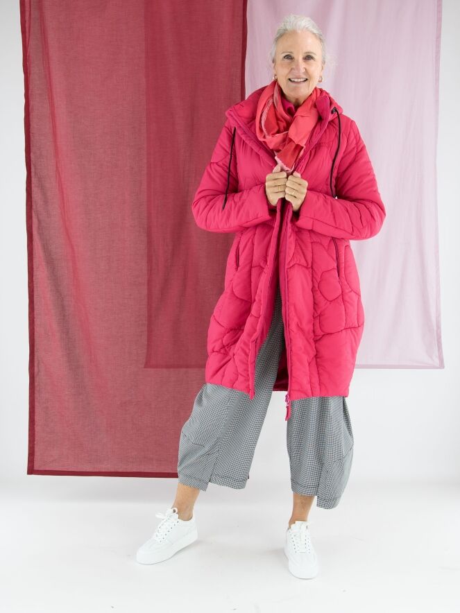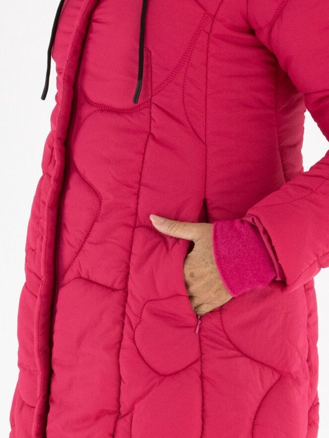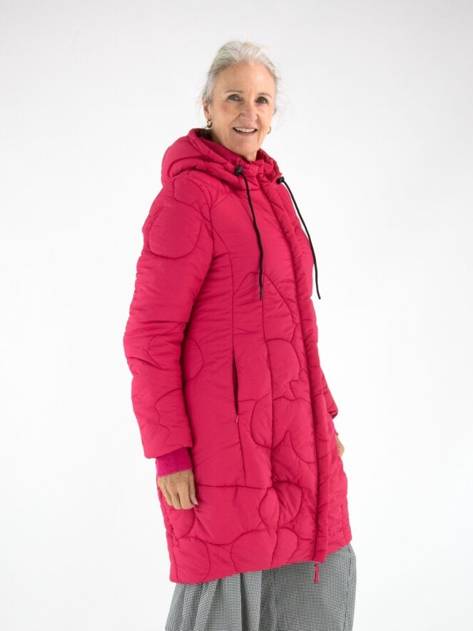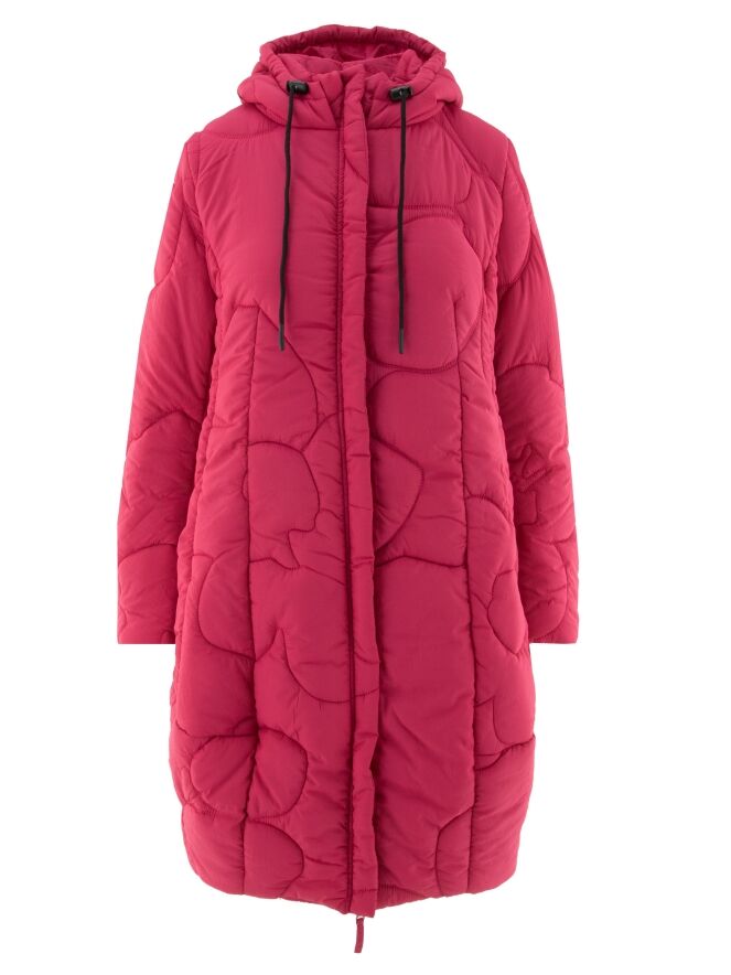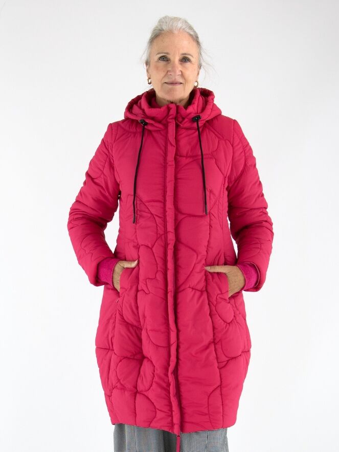 A mid-length, slightly fitted coat by Rundholz Black Label in pink. The coat is quilted in a floral pattern. The hood edge features a drawstring in a tunnel design that allows it to be adjusted. The side pockets are finished with zip closures, and the coat’s fastening is designed in grey. This coat can be washed at 30 degrees.