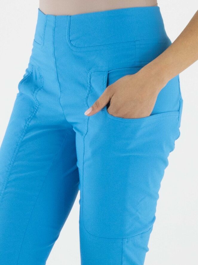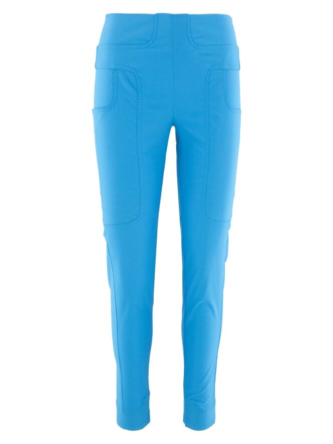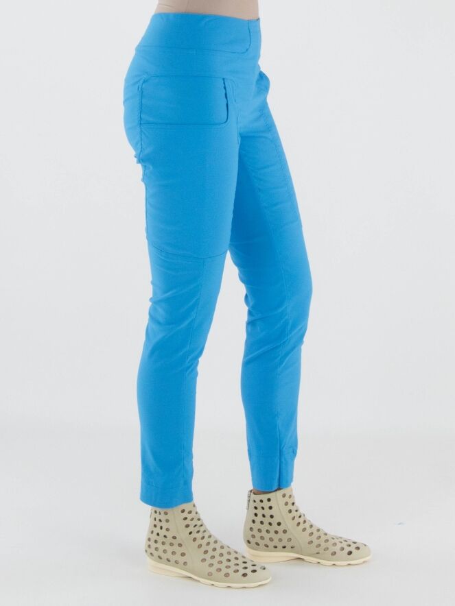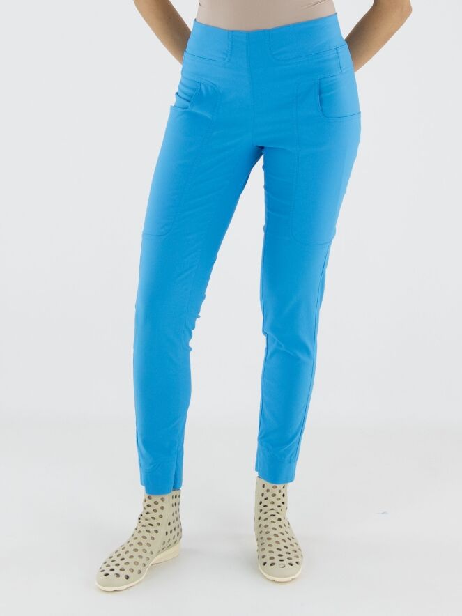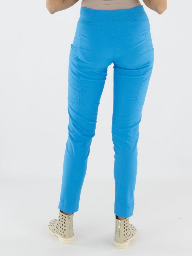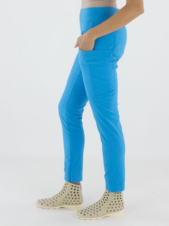A pair of trousers by Rundholz Black Label in bright blue. The waistband features a wide elastic band. Below the waist, the trousers have lowered, deep side pockets with a rounded edge. Approximately 8 cm above the hem, a double seam is stitched. These trousers can be washed at 30 degrees.