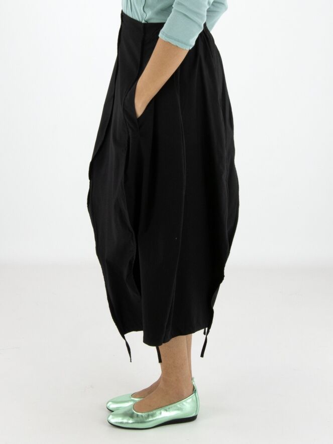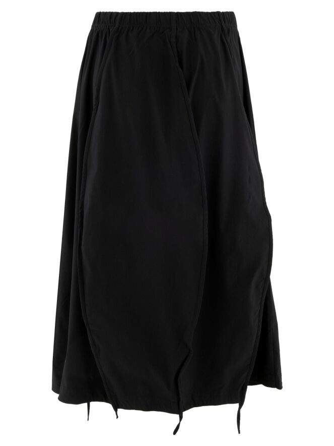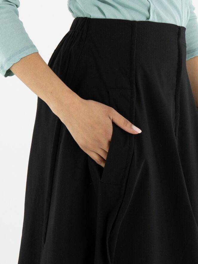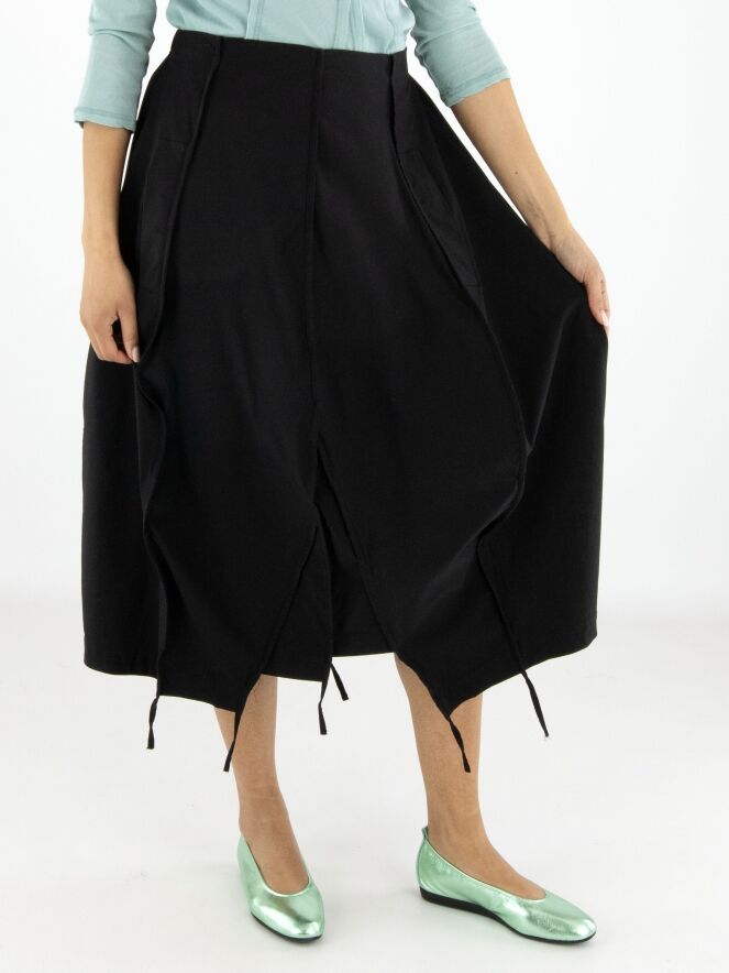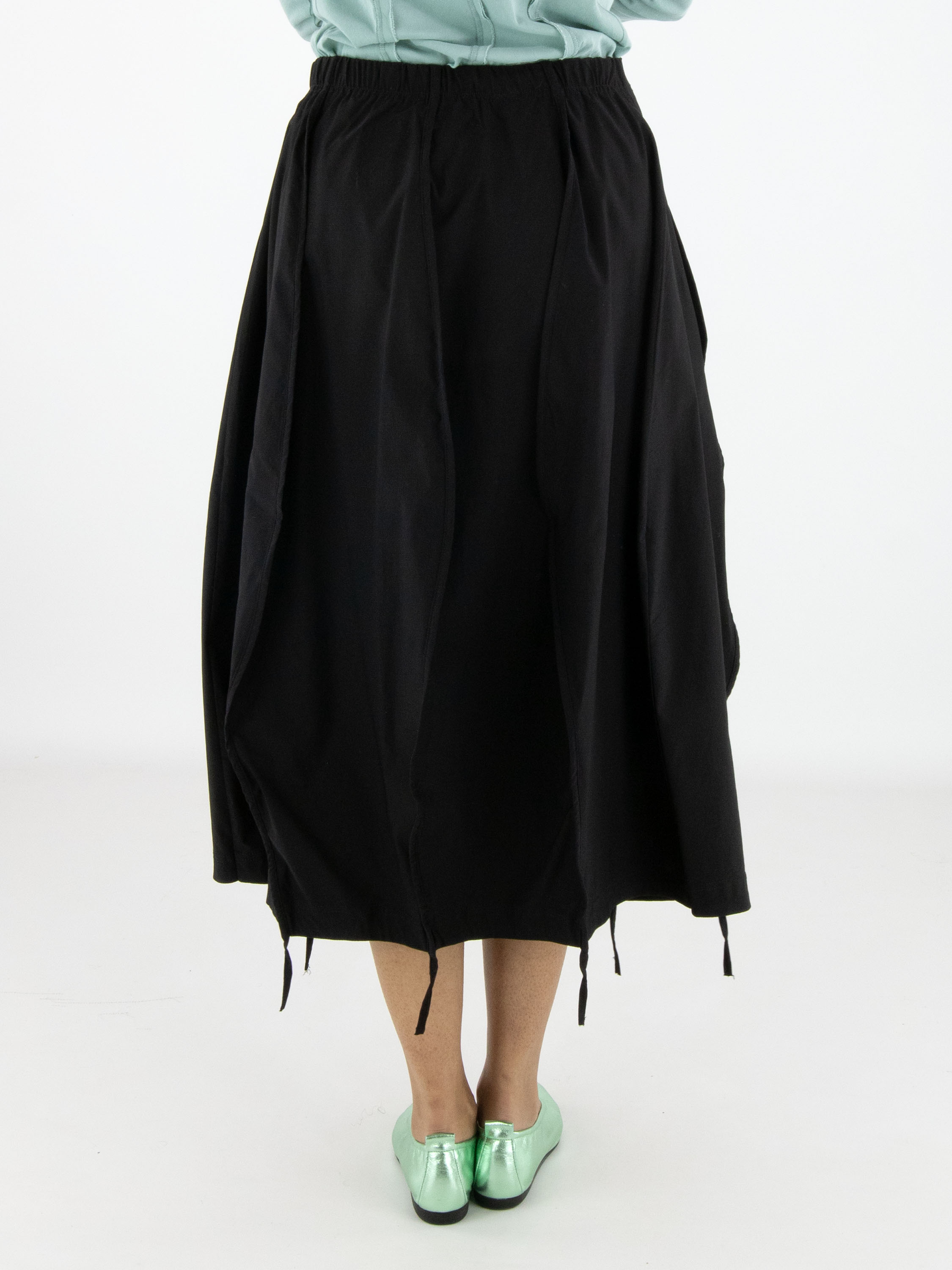 Skirt by Rundholz Black Label in black. The waist features a finely pleated elastic band, offering comfort and a subtly feminine fit. The silhouette falls into a gentle balloon shape towards the hem. Three inverted seams with trim detail are placed on both the front and back, with a short section extending below the hem as a subtle ribbon accent. Side pockets are positioned just below the waistband. Unlined, this exclusive designer skirt can be washed at 30 degrees.