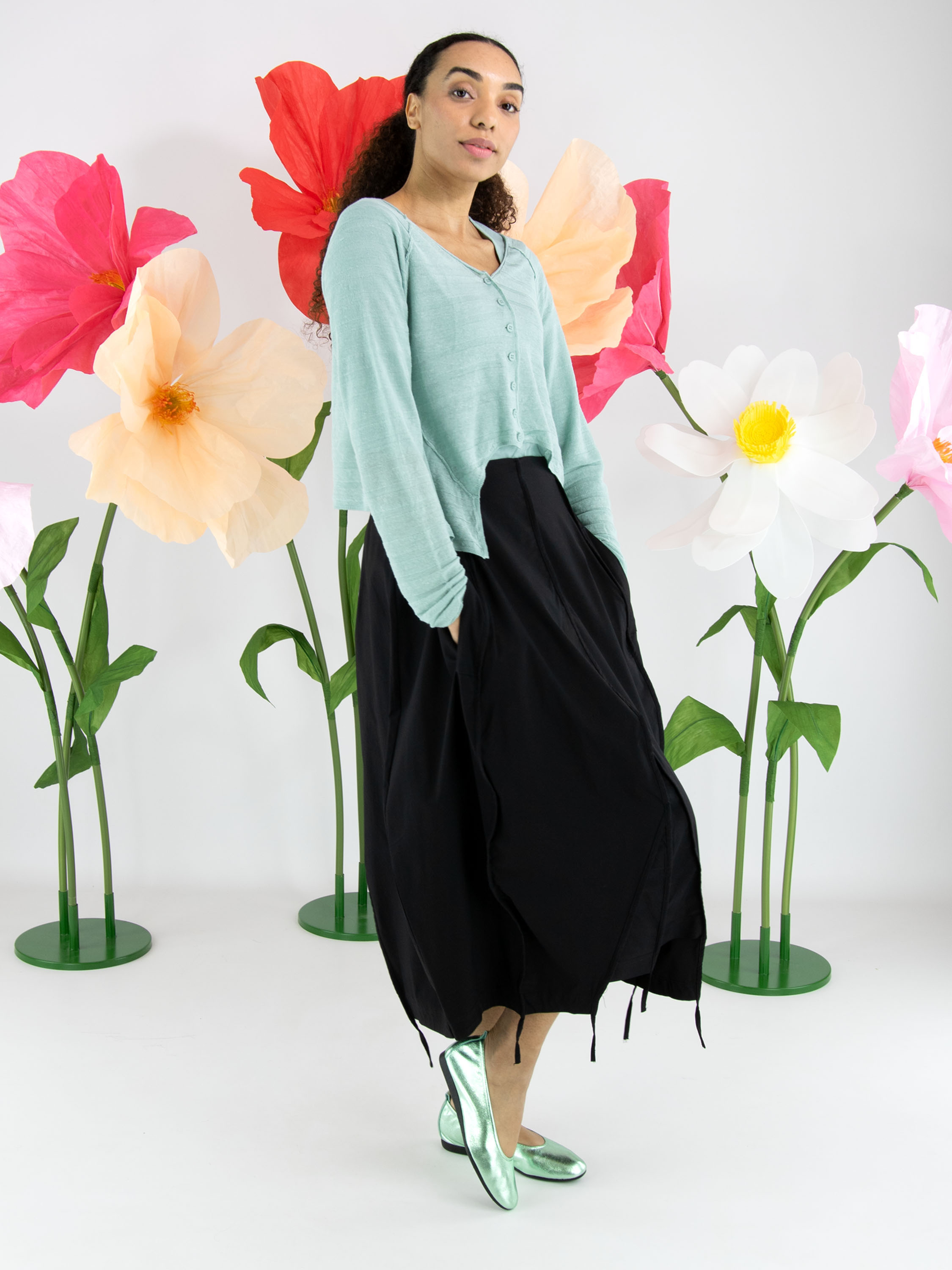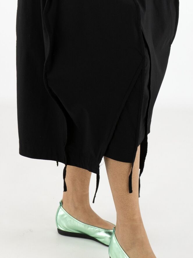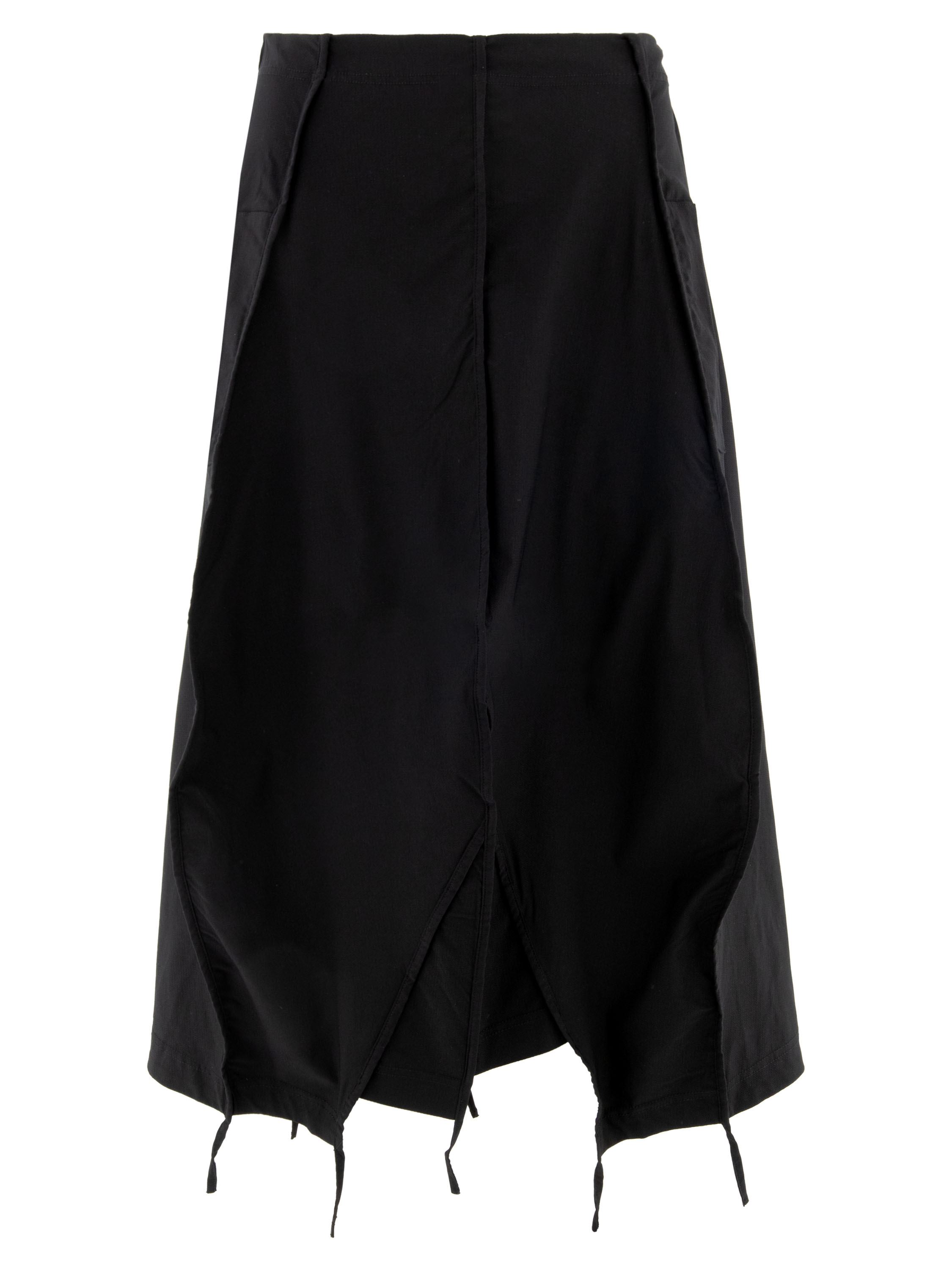 Skirt by Rundholz Black Label in black. The waist features a finely pleated elastic band, offering comfort and a subtly feminine fit. The silhouette falls into a gentle balloon shape towards the hem. Three inverted seams with trim detail are placed on both the front and back, with a short section extending below the hem as a subtle ribbon accent. Side pockets are positioned just below the waistband. Unlined, this exclusive designer skirt can be washed at 30 degrees.