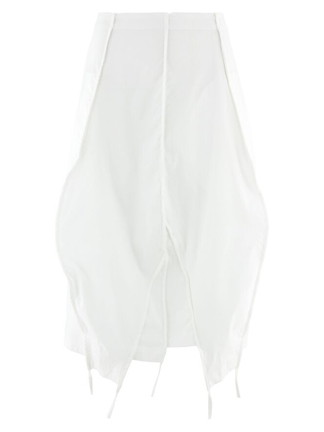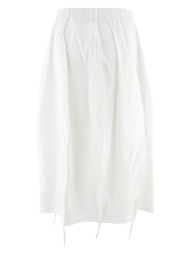 Skirt by Rundholz Black Label in off-white. The finely pleated elastic waistband ensures both comfort and a fluid fit. The skirt gently develops into a subtle balloon shape towards the hem. Three inverted seams with piping detail are featured on both the front and back, with a small section extending below the hem as a delicate ribbon accent. Side pockets are placed just below the waistband. The skirt is unlined and can be washed at 30 degrees.