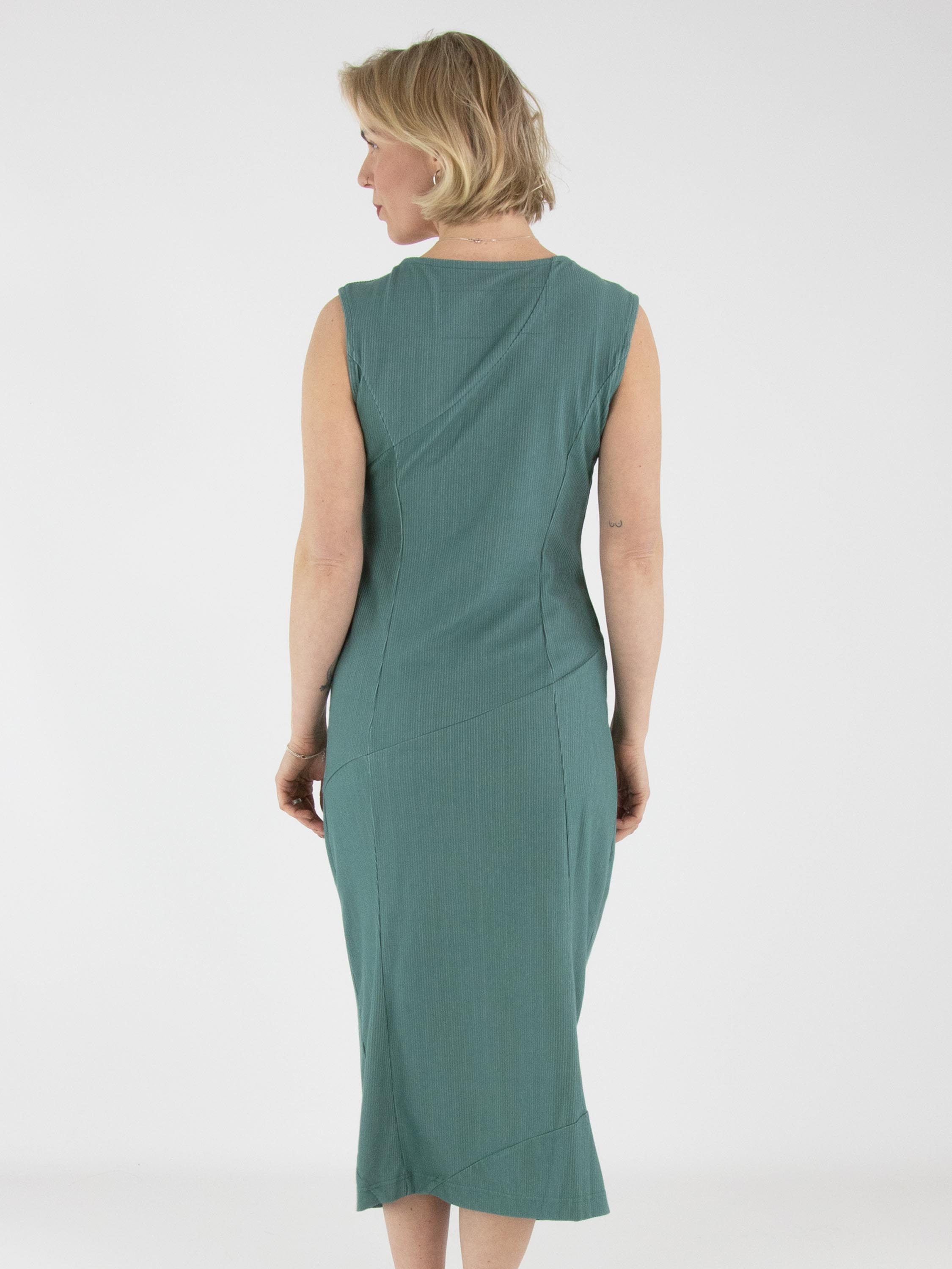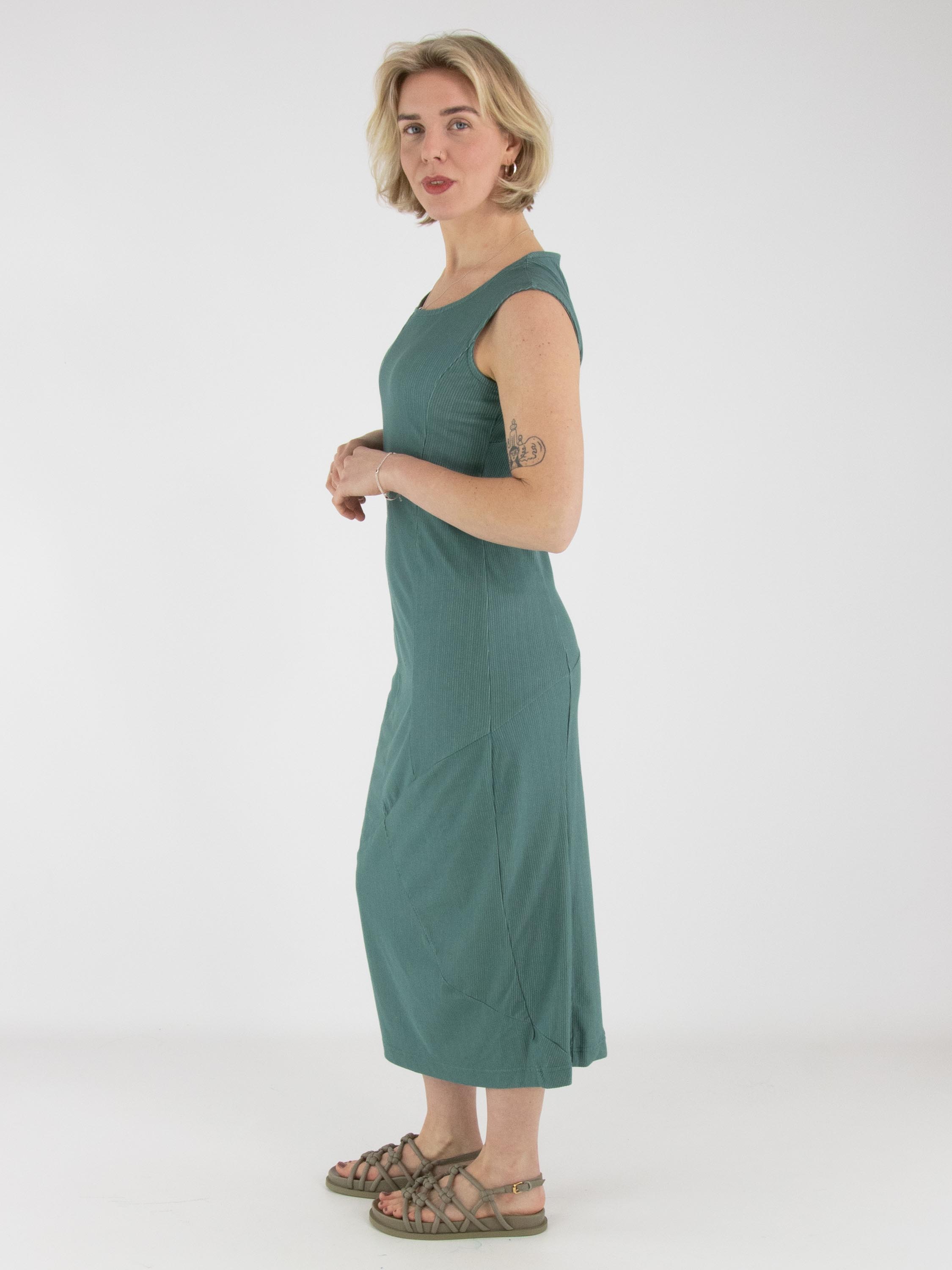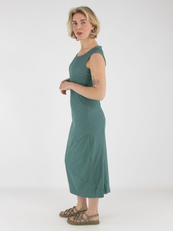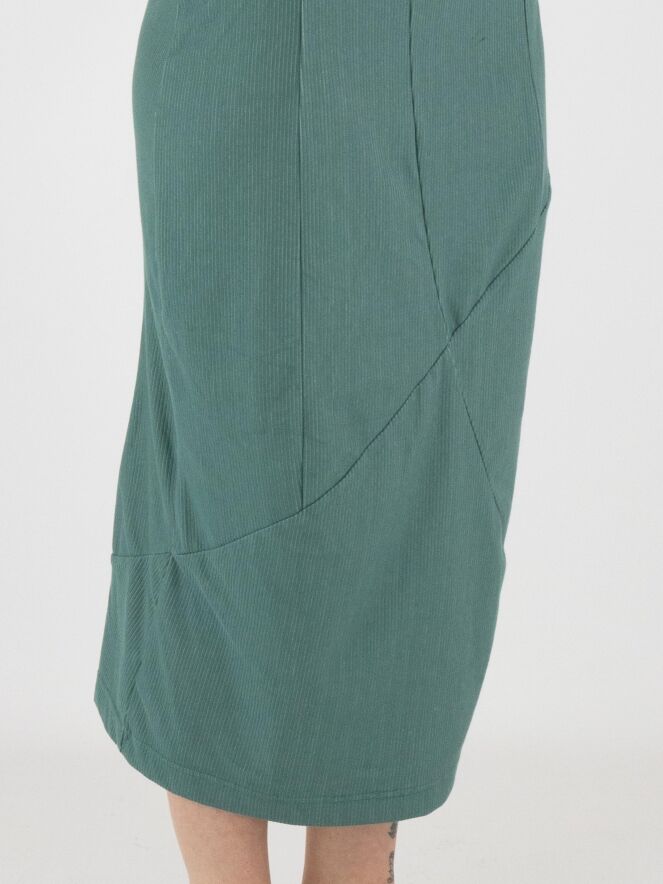 A dress by Rundholz Black Label in green with a fine vertically ribbed texture. The dress features a round neckline. The central seam runs diagonally downward from the waist, creating a subtle balloon effect. The fabric is lightly elastic and can be washed at 30 degrees.