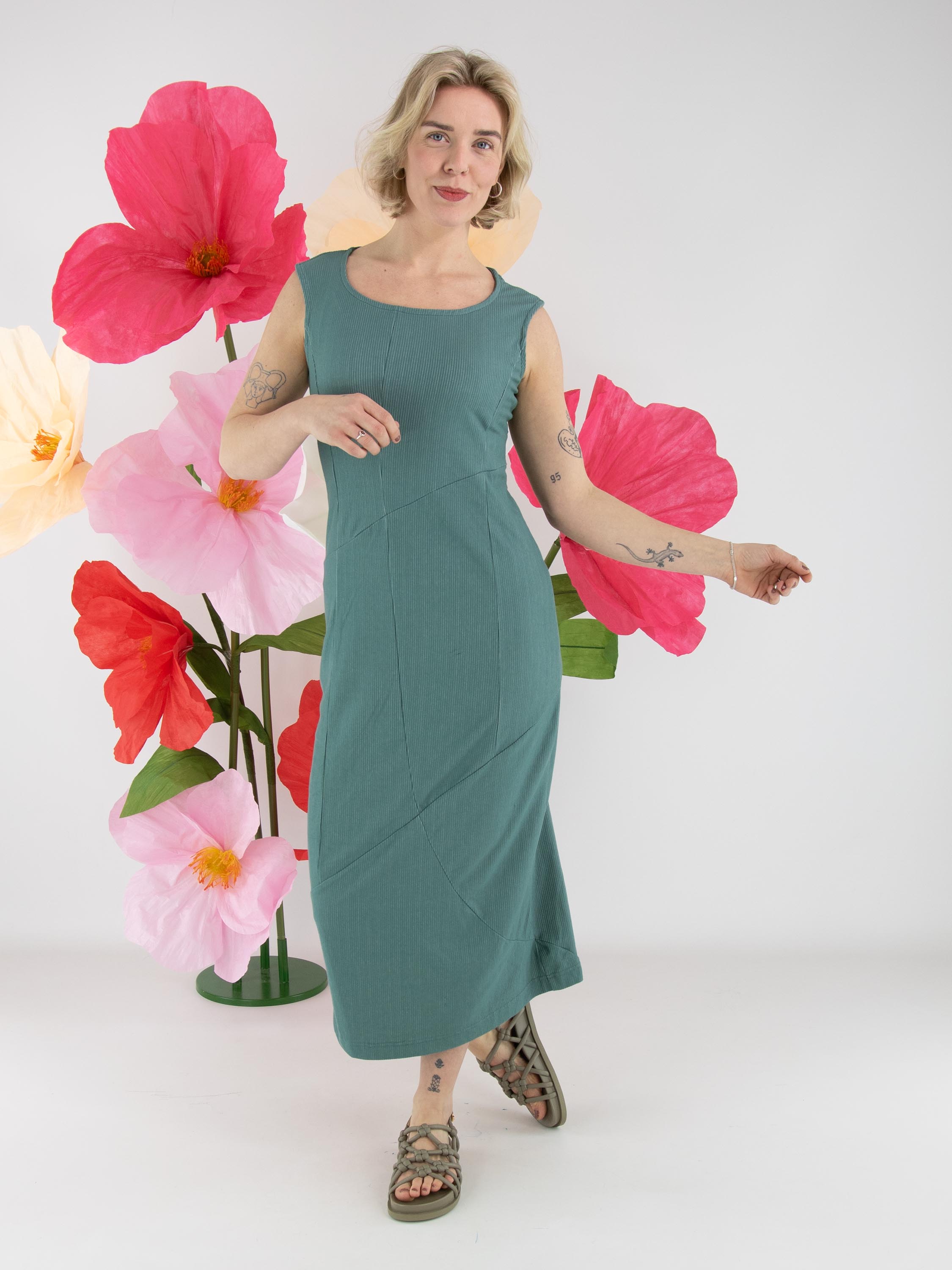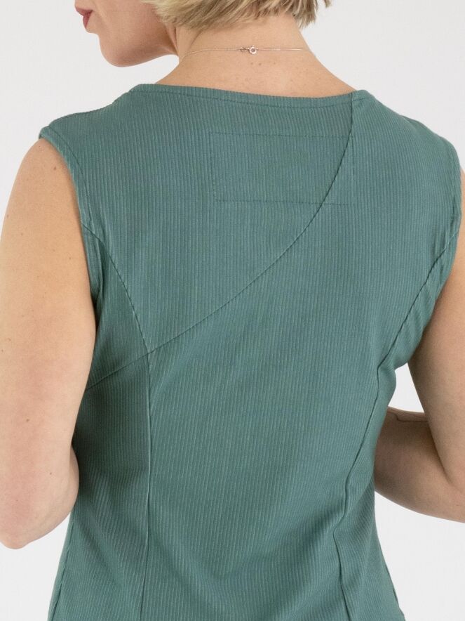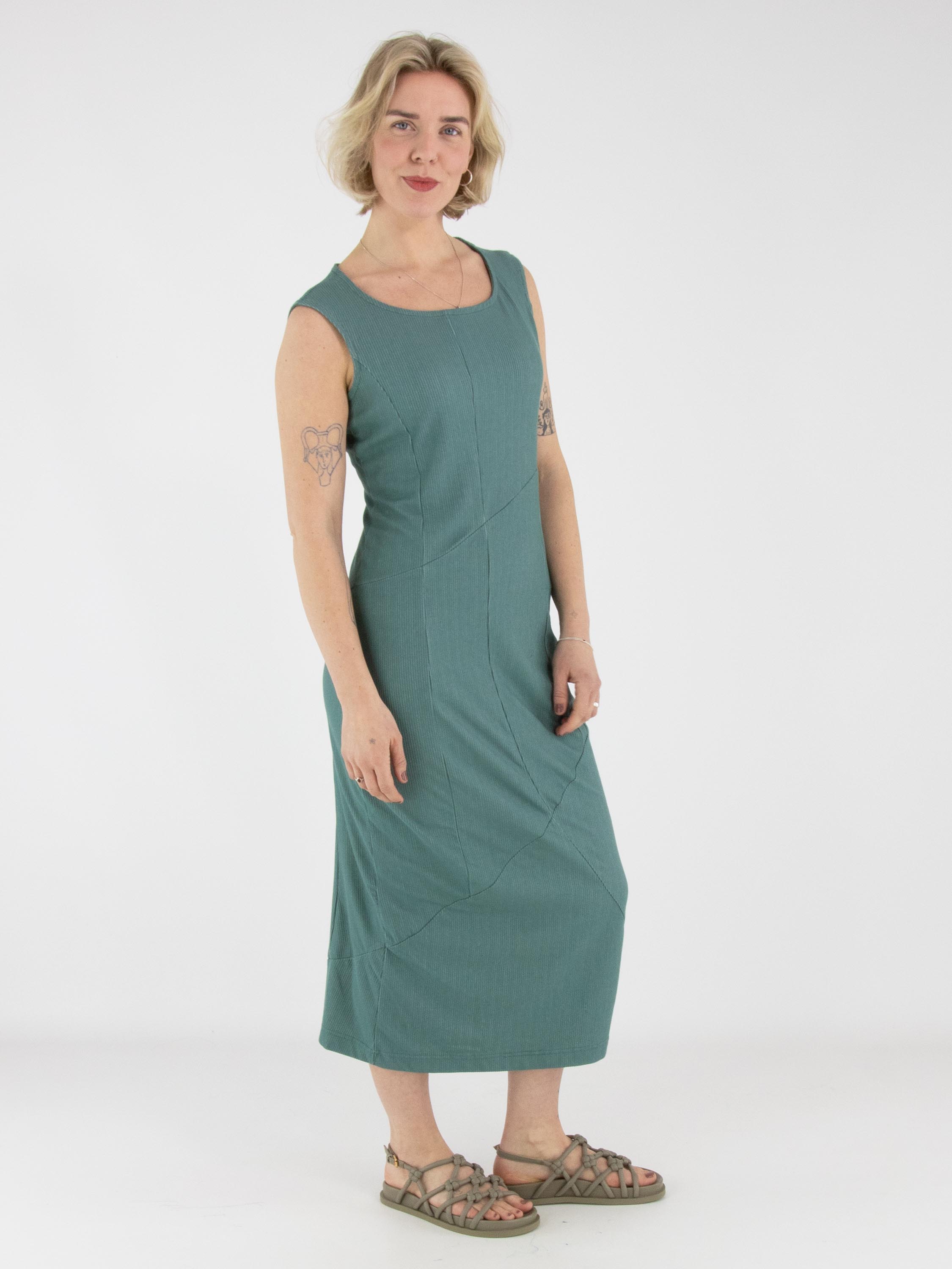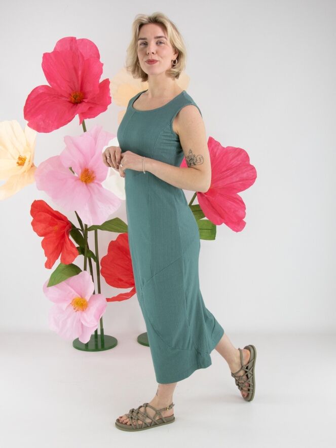 A dress by Rundholz Black Label in green with a fine vertically ribbed texture. The dress features a round neckline. The central seam runs diagonally downward from the waist, creating a subtle balloon effect. The fabric is lightly elastic and can be washed at 30 degrees.